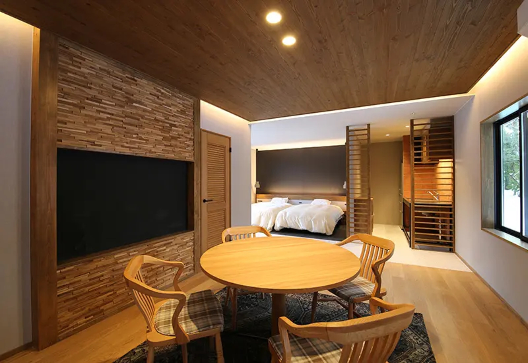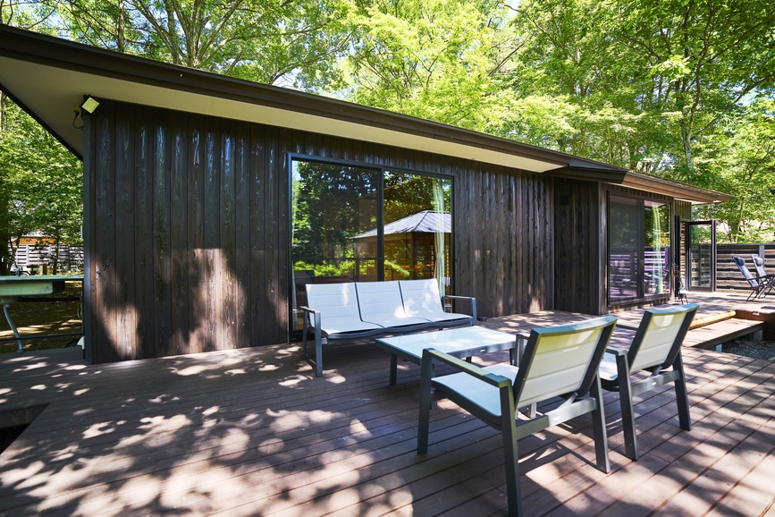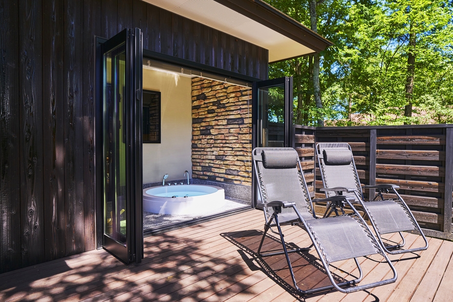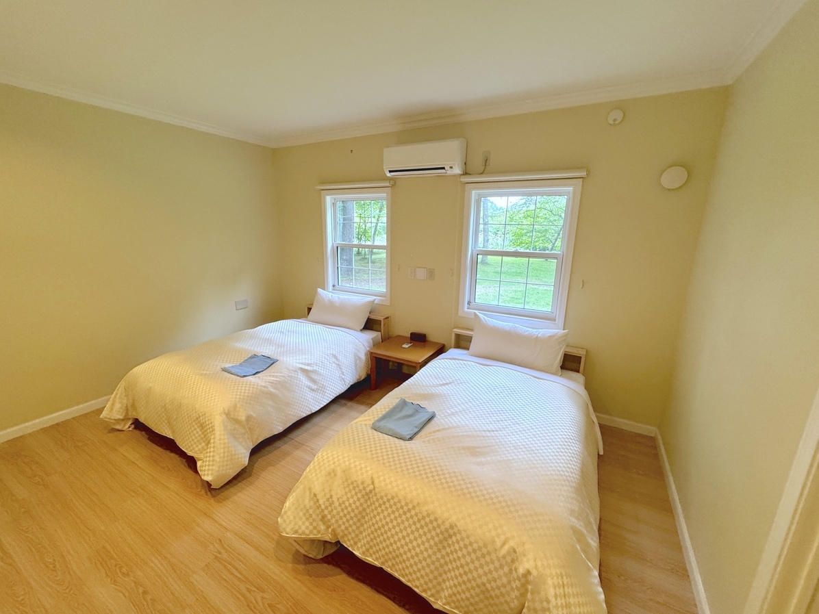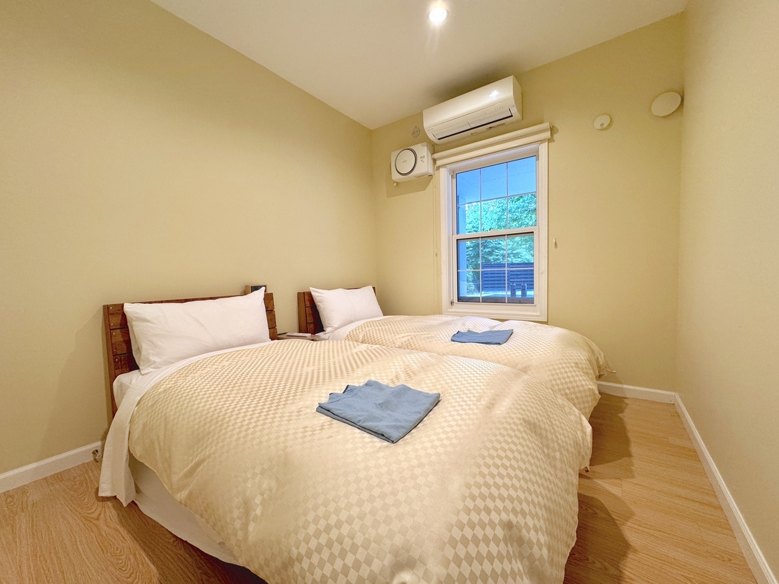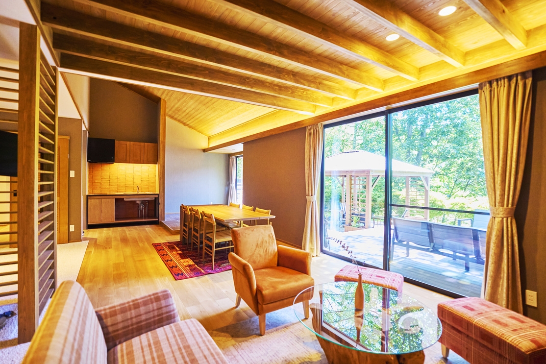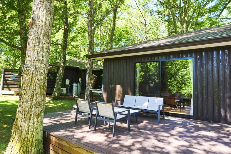 シングルベッド2台の寝室×2部屋・セミダブルベッド2台の寝室×1部屋・キッチン・リビング・サウナ・ジャグジーバス・ウッドデッキ・BBQガスコンロ(有料)
