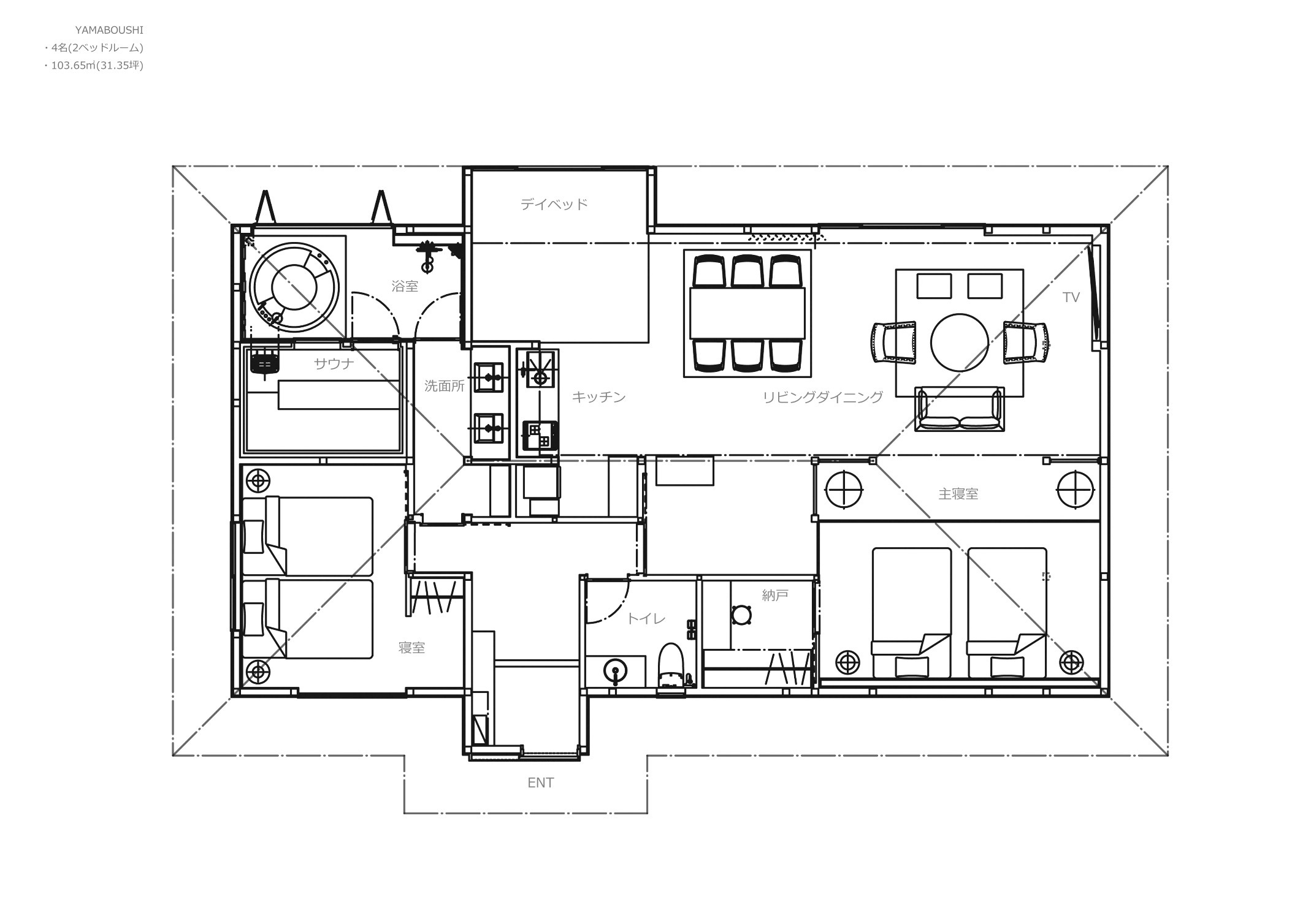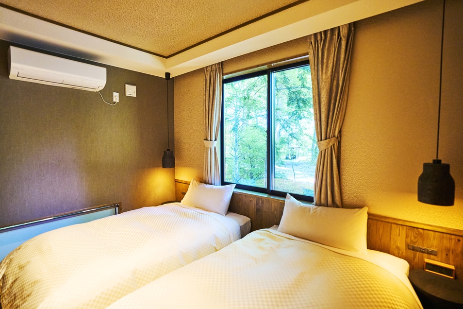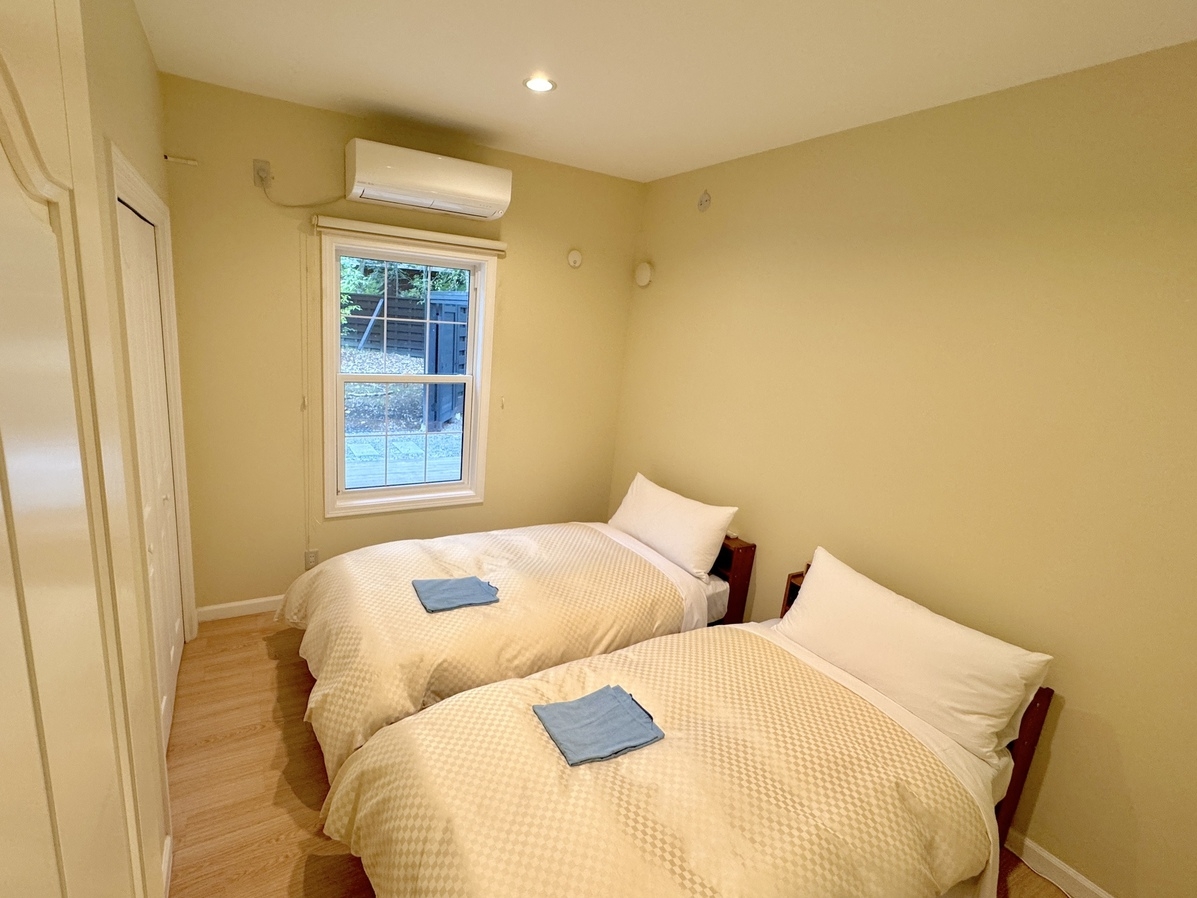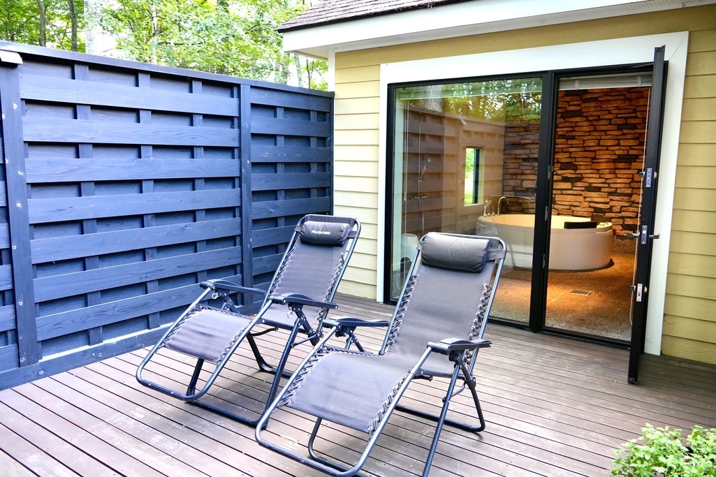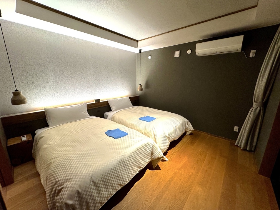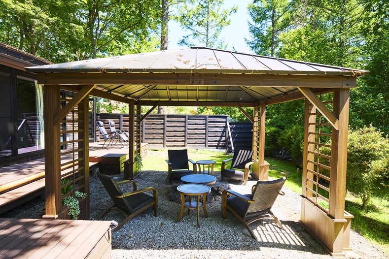 シングルベッド2台の寝室×2部屋・セミダブルベッド2台の寝室×1部屋・キッチン・リビング・サウナ・ジャグジーバス・ウッドデッキ・BBQガスコンロ(有料)