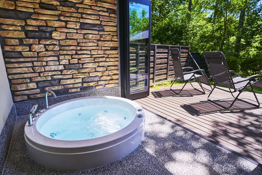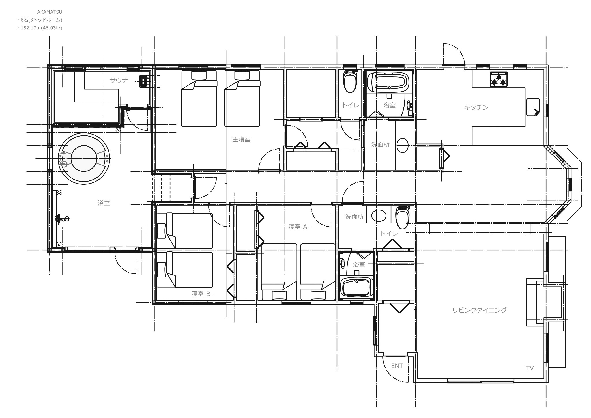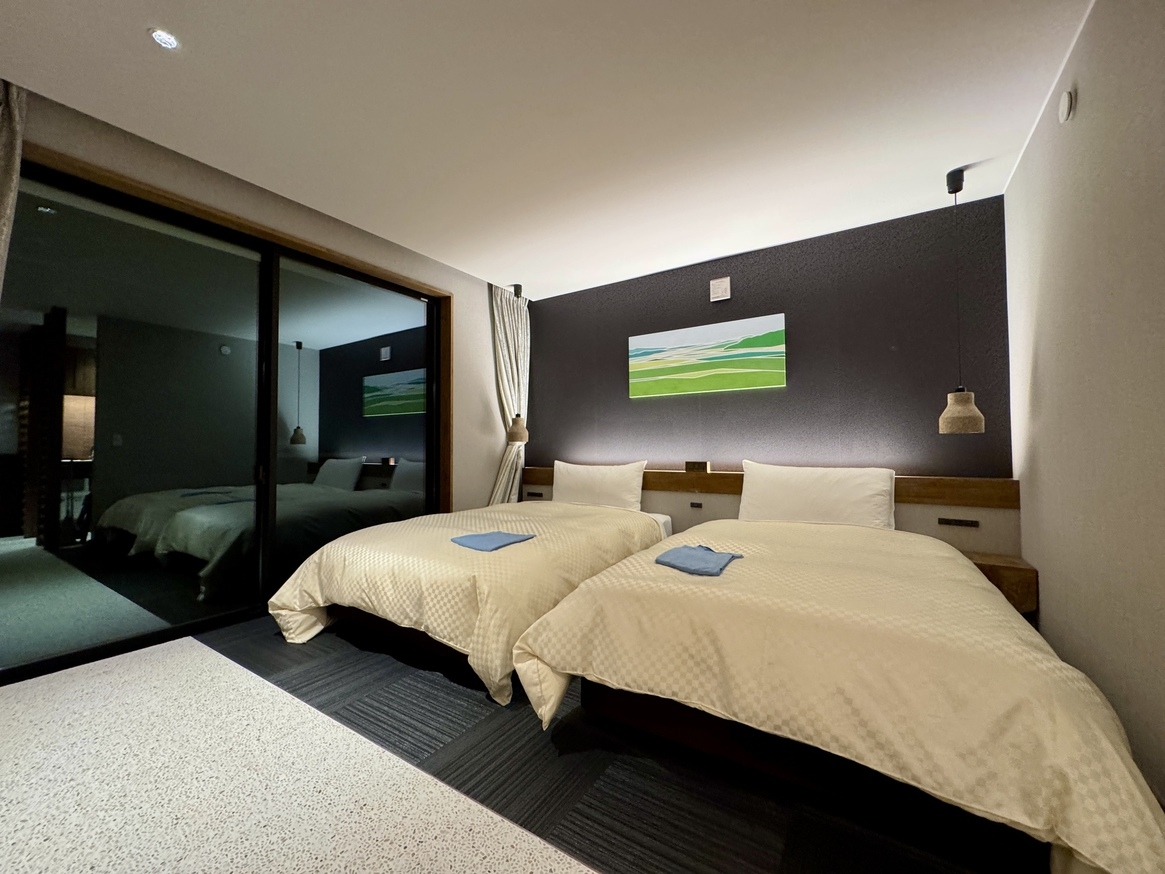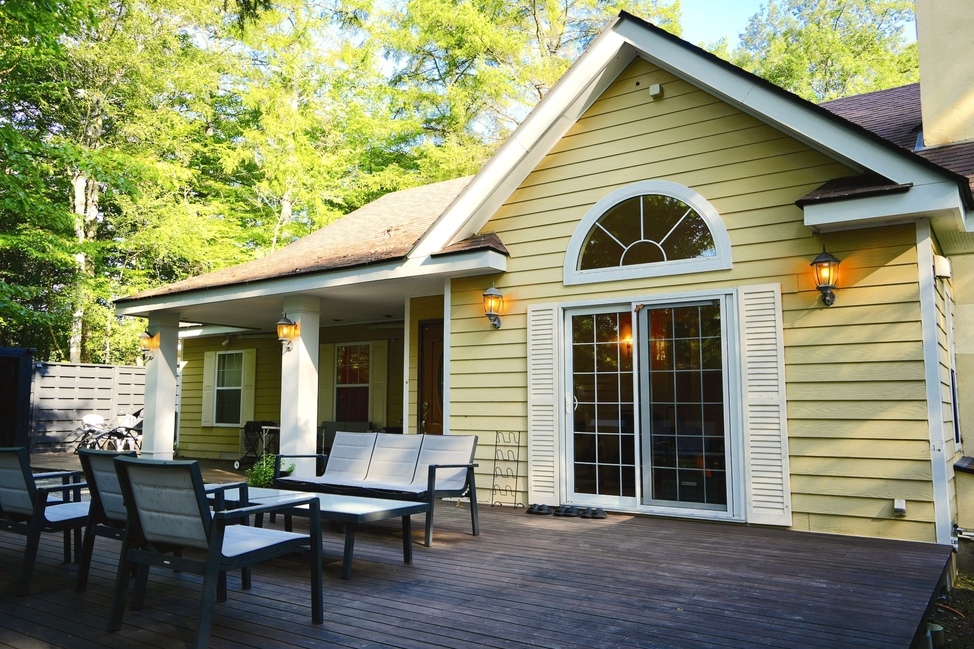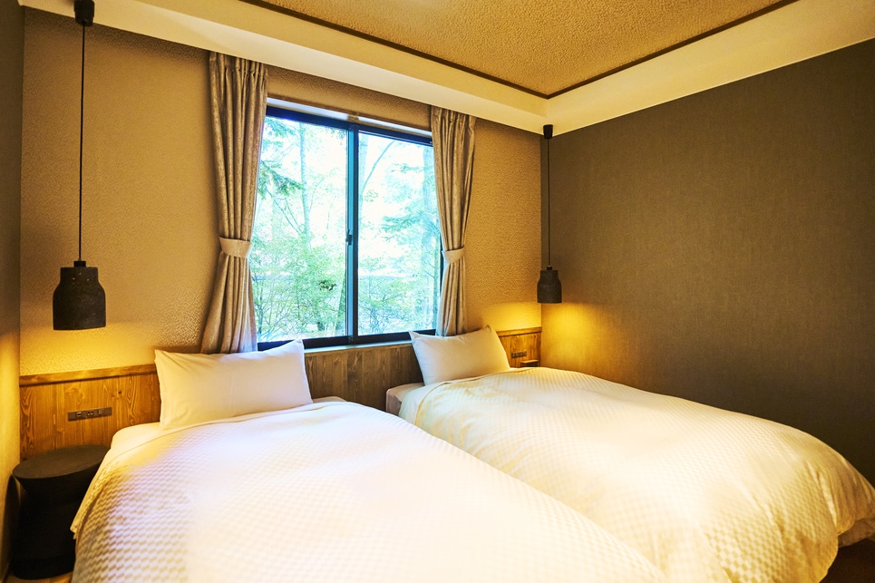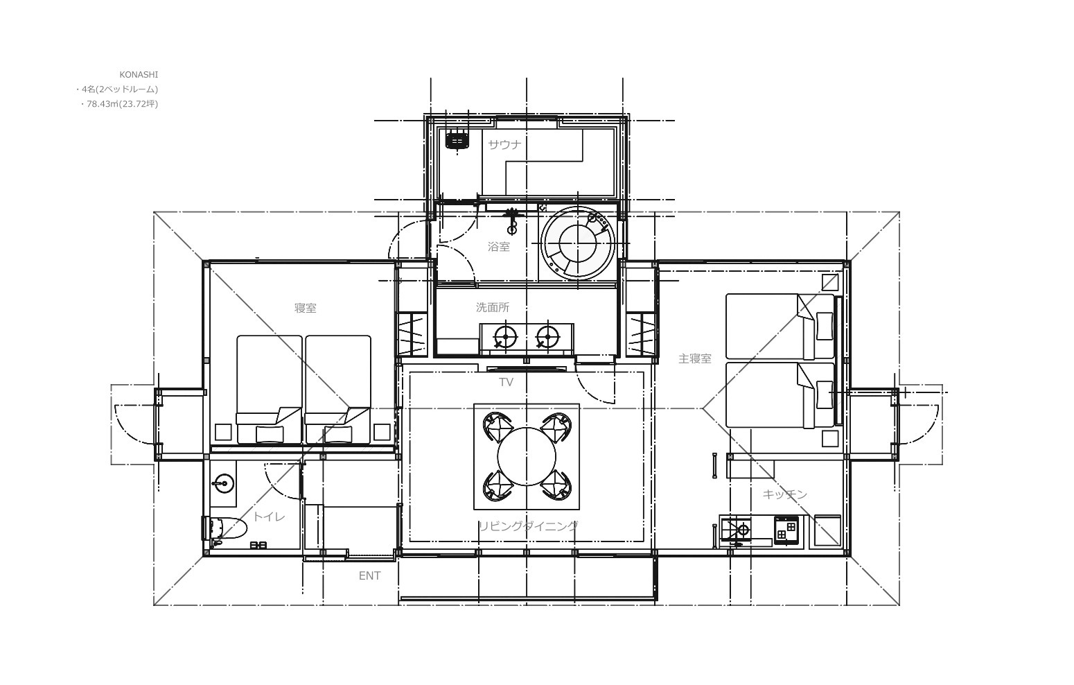 シングルベッド2台の寝室×2部屋・セミダブルベッド2台の寝室×1部屋・キッチン・リビング・サウナ・ジャグジーバス・ウッドデッキ・BBQガスコンロ(有料)
