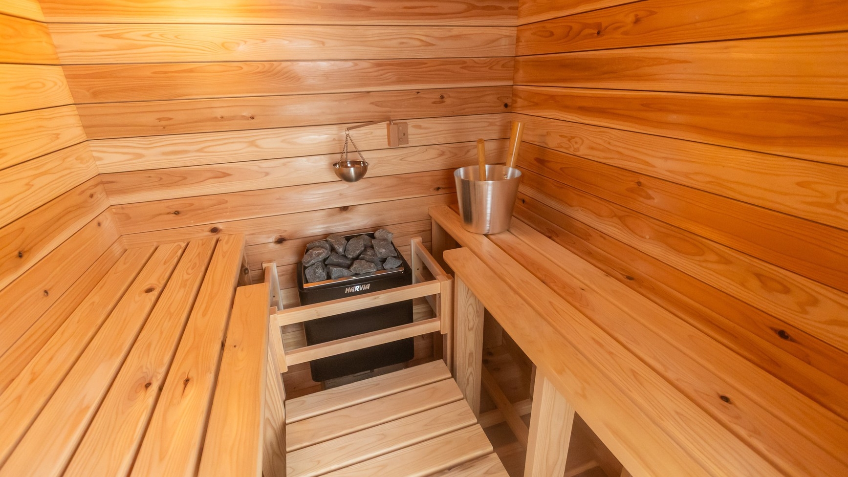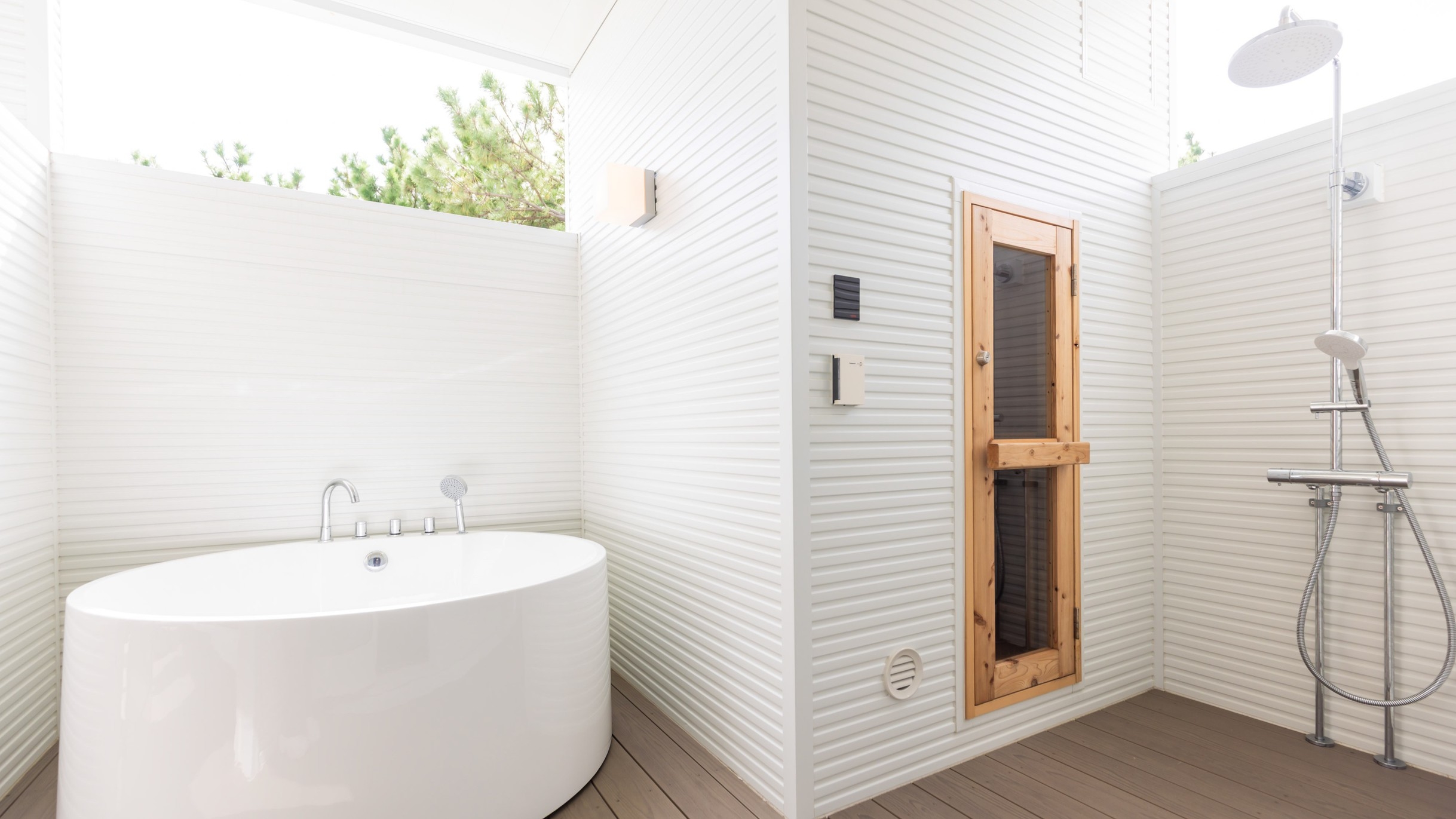 サウナと露天ジャグジーのあるLuxuryトレーラーハウス リビングルームとベッドルーム、サニタリールームも充実! テラスではのんびりとリラックス♪