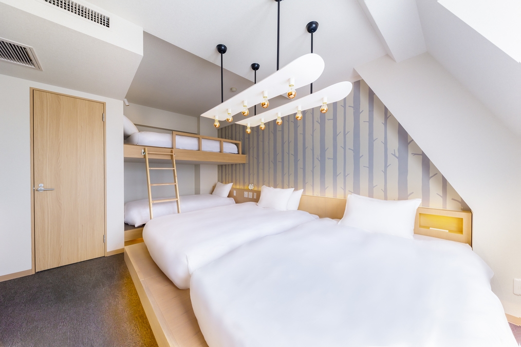 モダンで広々とした2台のセミダブルベッドと、シングルベッド1台があるお部屋。55インチのテレビ、ウォークインシャワー、2つのシンク、ウォシュレット付きトイレ、冷