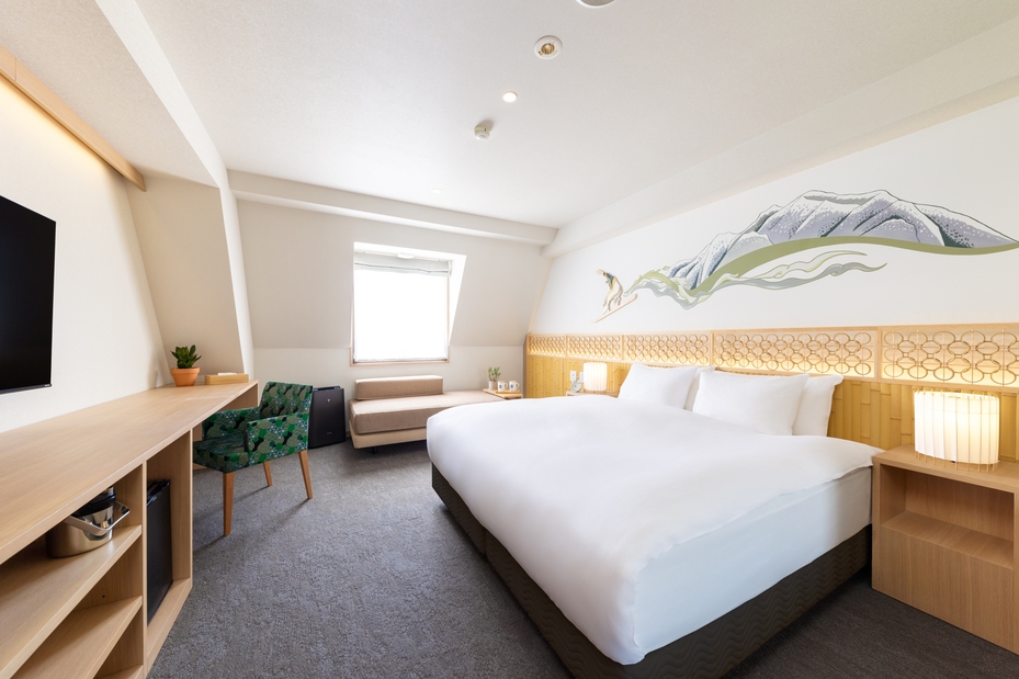 シングルベッド2台、さらにソファーベッドの広々としたお部屋には、55インチのテレビ、ウォークインシャワー、ウォシュレット付きトイレ、小型冷蔵庫、Wi-Fi