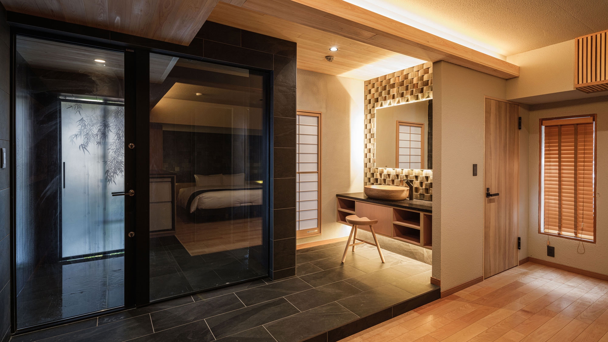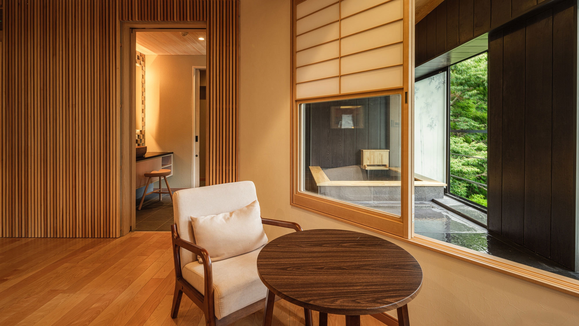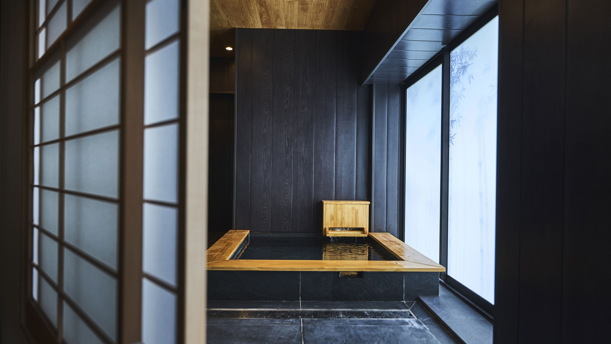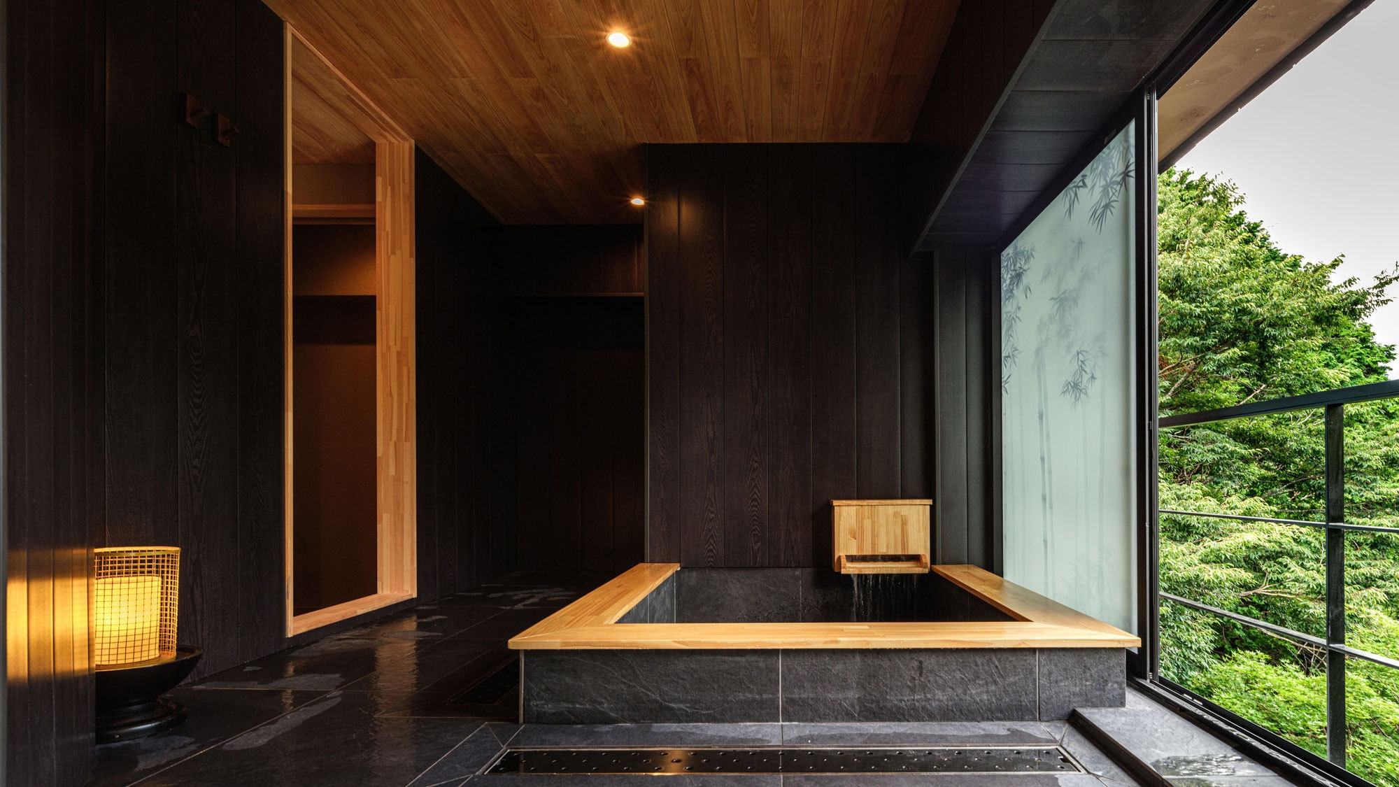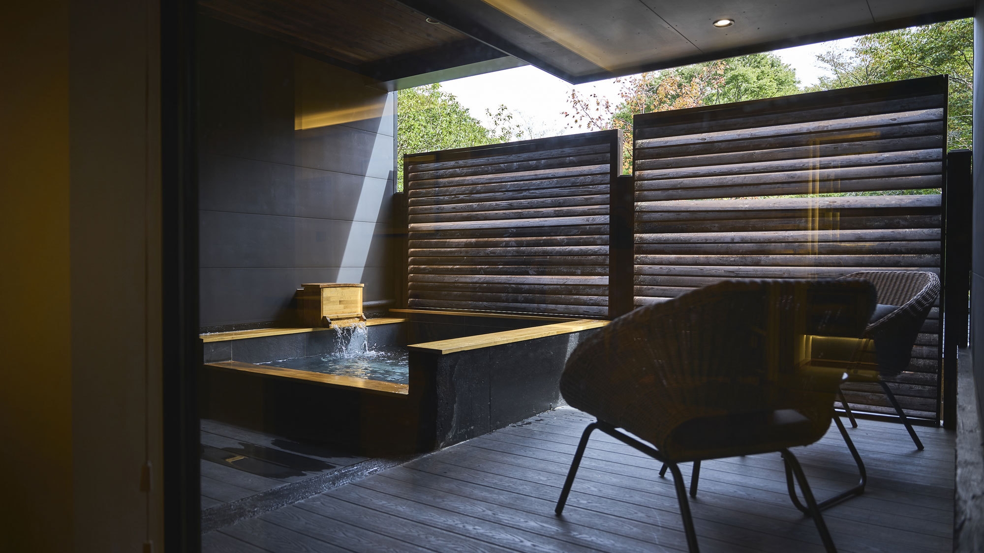 全客室には、すべてに露天風呂または温泉風呂を備え、四季の移ろいを感じながら心ゆくまで湯浴みをお楽しみいただけます。