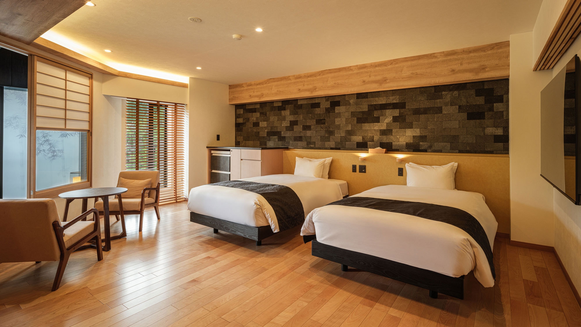 広々としたツインベッドのお部屋に窓から自然光が差し込み、心地よい開放感に包まれます。落ち着いた雰囲気の中でゆったりと過ごせる贅沢なお部屋です