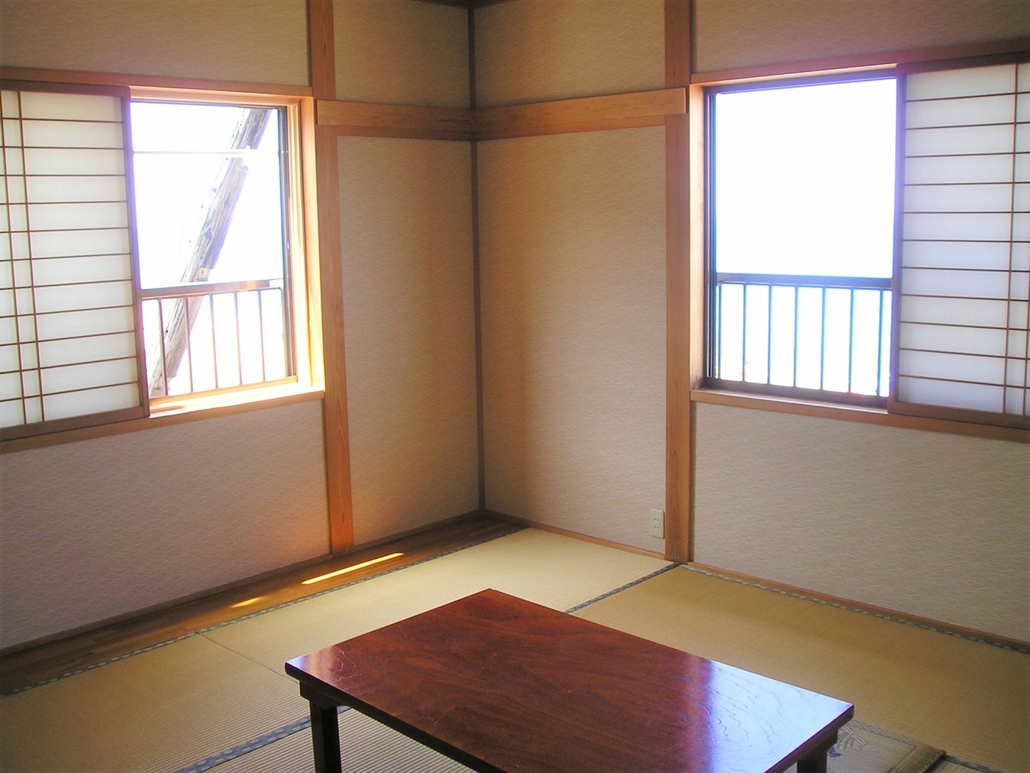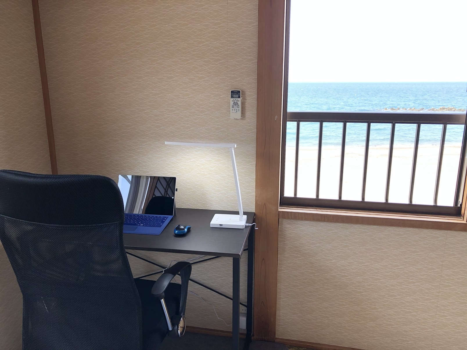 日本海を一望できる海側和室。エアコン完備。冷蔵庫・バス・トイレなし
