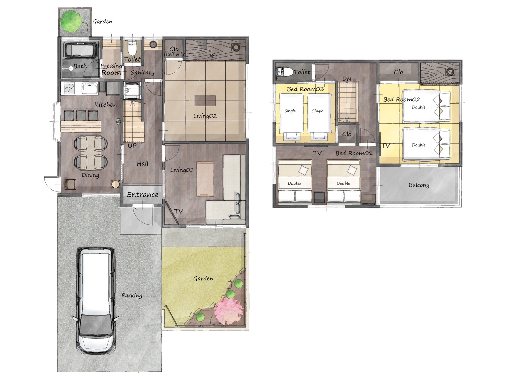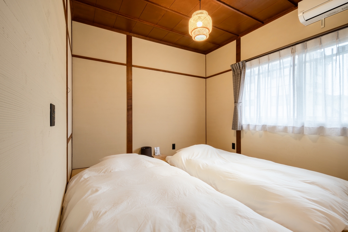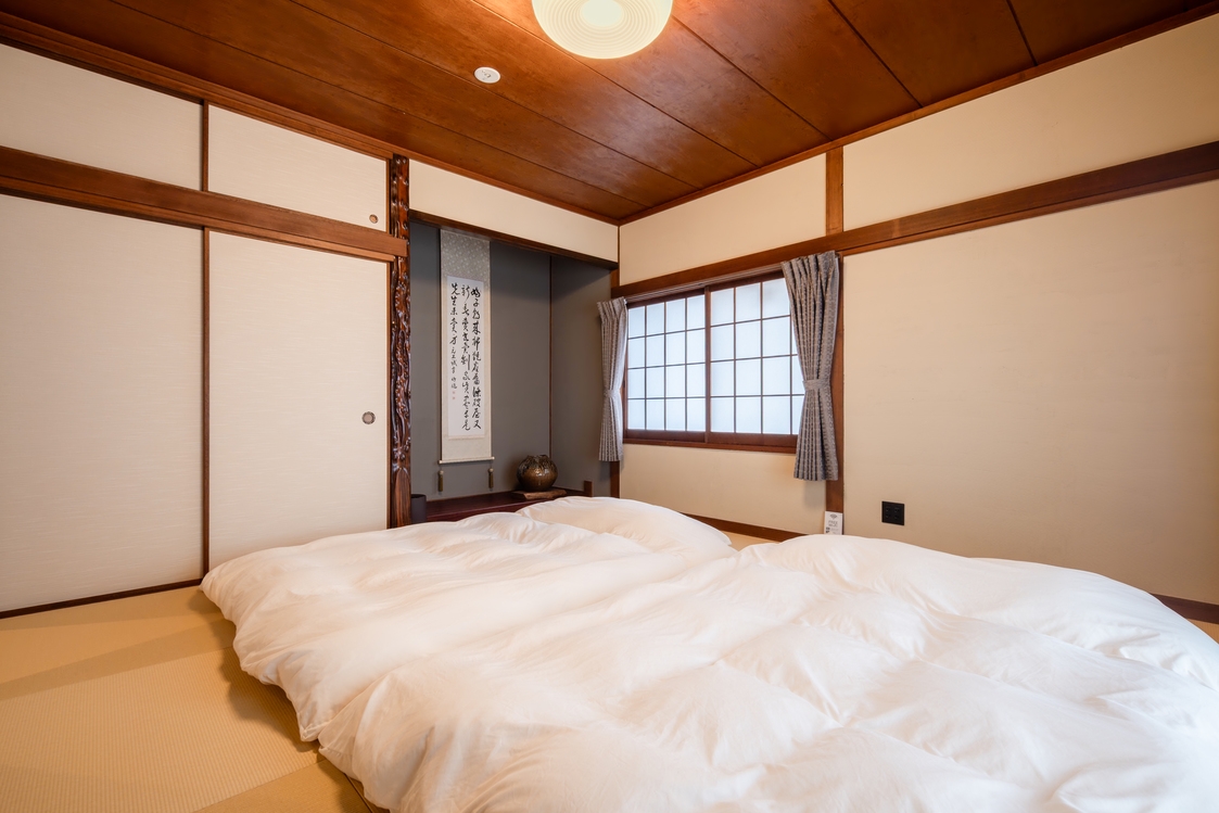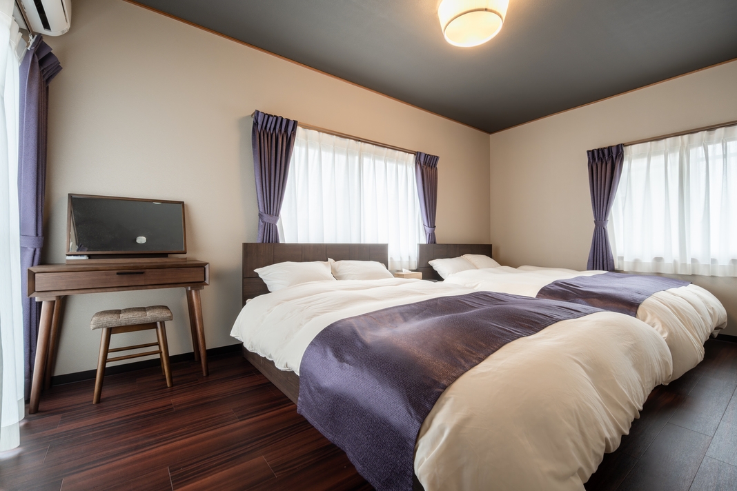 【フリードリンクプレゼント♪】冷蔵庫内に、シャンパン・ビール・サイダー等のフリードリンクをご用意しています!温泉に入ったあとに飲むと格別です!※飲み物の内容は時期によって変化します。【何名様でも同料金】何名様でご宿泊の場合でも、ご宿泊料金は変わりません。大人数でご利用いただければ、お得にご宿泊いただけます。貸切の温泉に浸かってごゆっくりとお過ごしください♪※最大ご宿泊人数は14名です。【チェックイン・チェックアウト時間】チェックイン 15:00〜チェックアウト 〜10:00【寝室、寝具】寝室は1階に1つ、2階に3つあります。1階の寝室にはダブルサイズの布団が2組あります。2階の寝室には、ダブルベッドが2つ、ダブルサイズの布団が2組、シングルサイズの布団が2組あります。※最大ご宿泊人数は14名です。【各部屋/設備】◆リビングテレビ、ソファー、テーブル、物干し、ハンガー◆ダイニング/キッチン★冷蔵庫にウェルカムドリンク(シャンパン、ビール、ラムネ等)をご用意しておりますので、お気軽にお飲みください★ウォーターサーバー、テーブル、椅子6脚、子供用椅子1脚、冷蔵庫(冷凍庫機能あり)、電子レンジ、電気ケトル、炊飯器、IHクッキングヒーター(3口付)、包丁、フライ返し、おたま、キッチン用はさみ、しゃもじ、鍋2、フライパン2、ボウル、洗剤、スポンジ、キッチンペーパー、丼ぶり茶碗、大皿/小皿類、コップ、マグカップ、ワイングラス、箸、スプーン、フォーク、お子様用食器※衛生上の配慮から、調味料はご準備しておりません。ご了承ください。【その他/設備】・温泉有・WiFi完備・エアコン完備・洗濯機・掃除機・ヘアドライヤー・シャンプー・リンス・ボディソープ・無料歯ブラシ・無料貸フェイスタオル・無料貸バスタオル※チェックイン/チェックアウト時間チェックイン:15:00〜チェックアウト:〜10:00