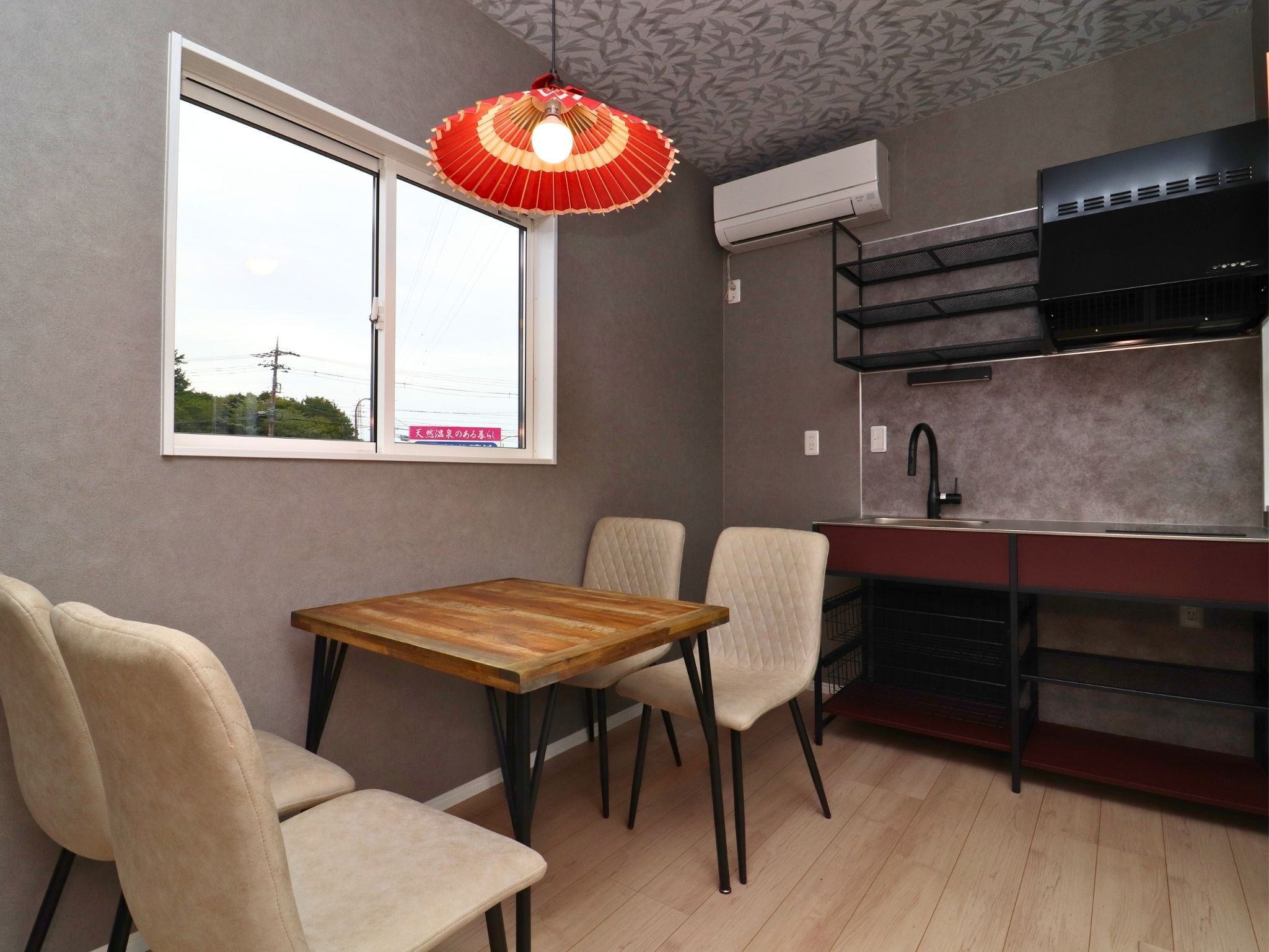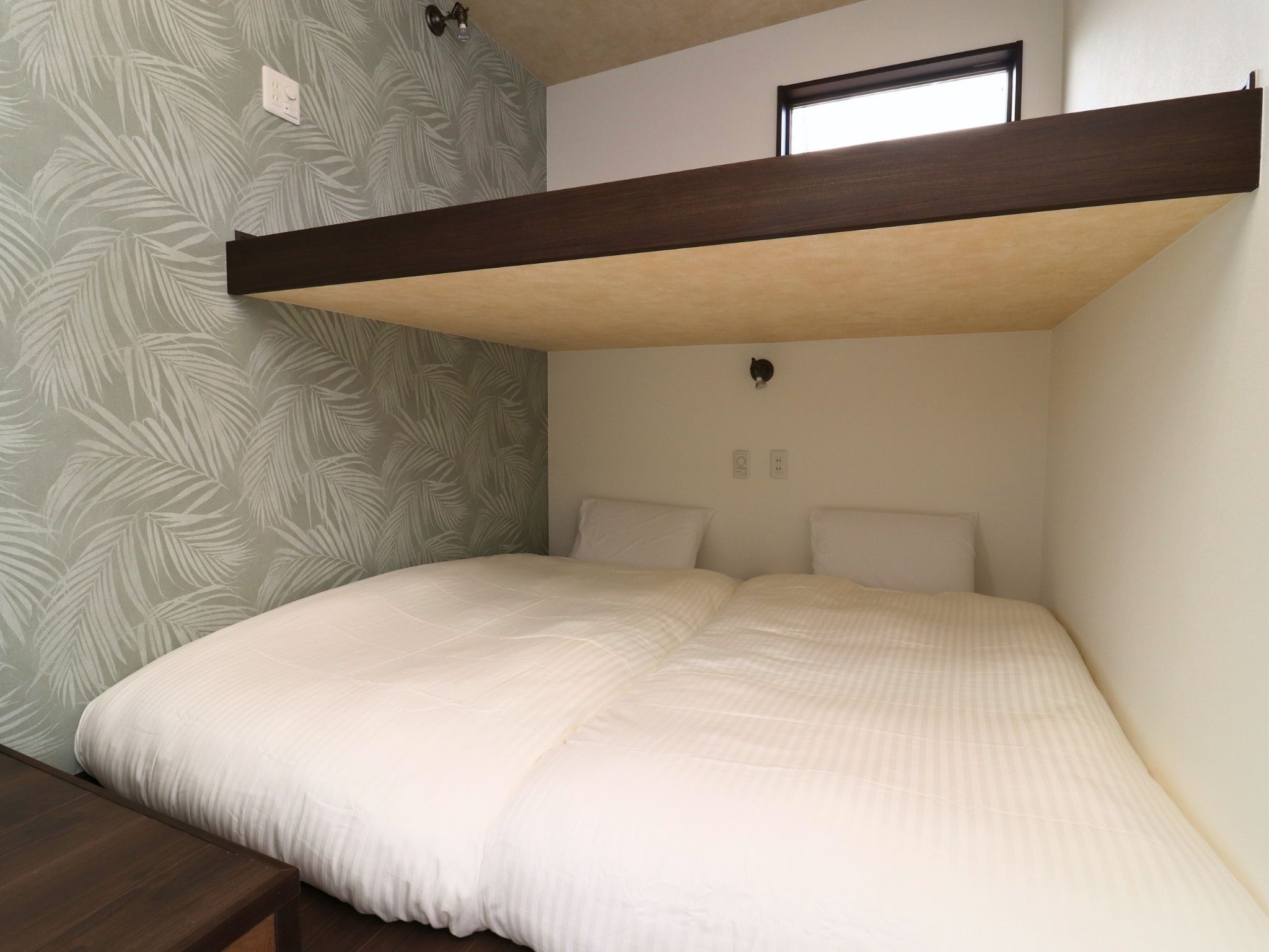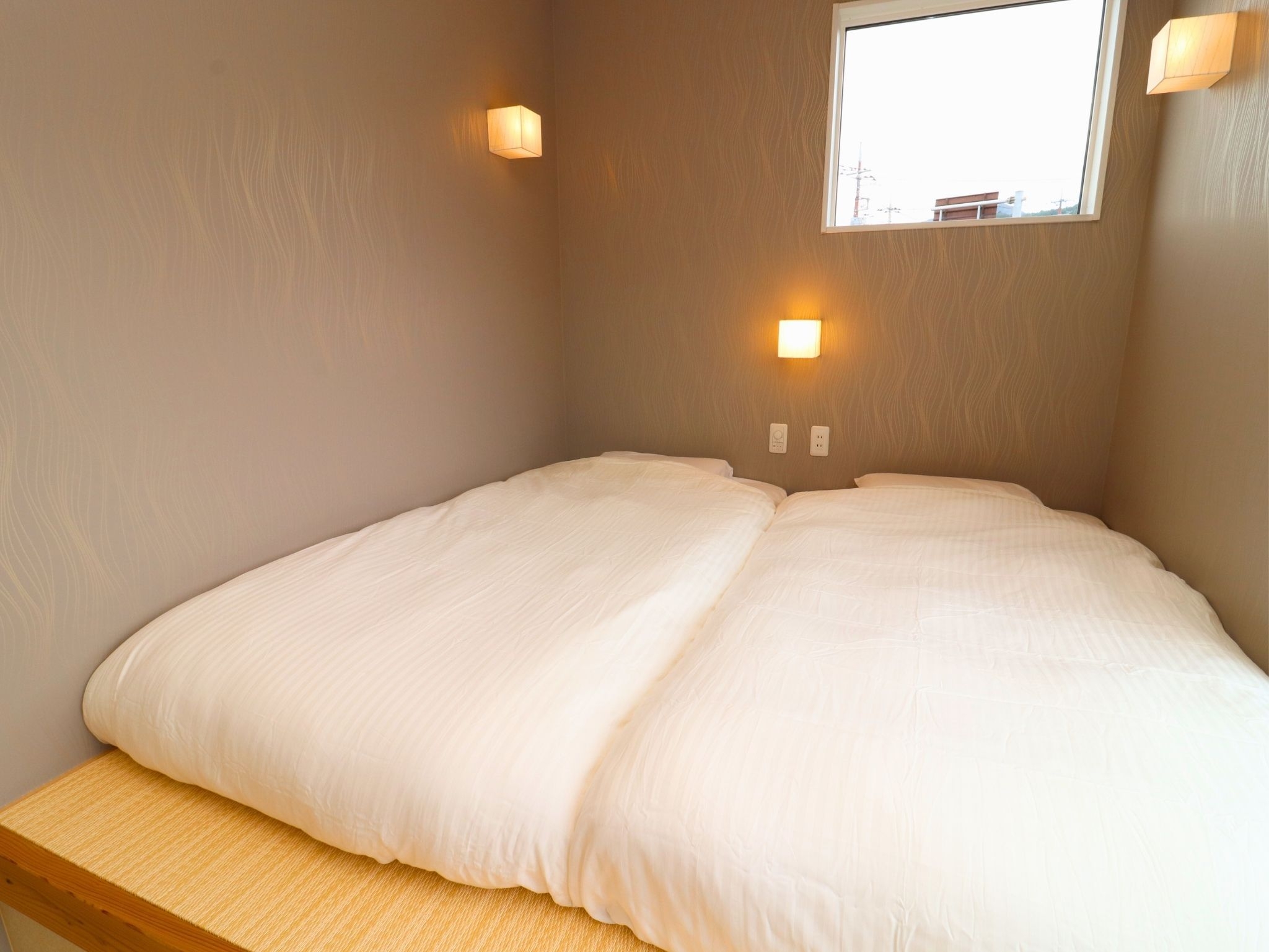【BASE03−Sky】 和の落ち着きとモダンな快適性を融合させたお部屋です。グループでのご宿泊に最適なシングルサイズのマットレスを4台配置。