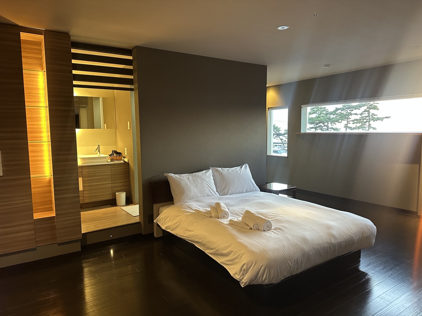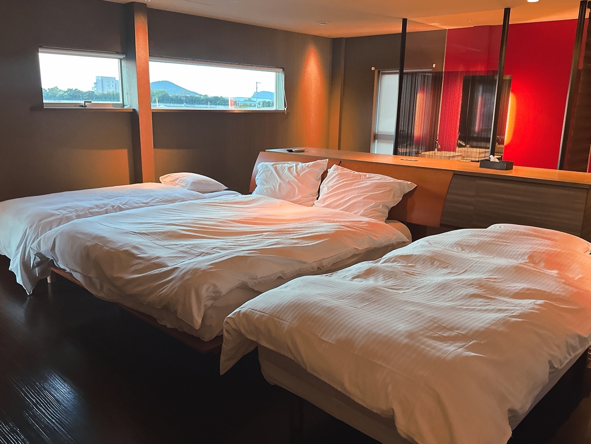 本プランは、1日1組限定の一棟貸しプライベートヴィラを素泊まりでご利用いただけます。父母ヶ浜まで車で約1分の立地で、移動に時間を取られず観光を楽しめることが強みです。チェックインからチェックアウトまで空間は完全貸切です。近くにコンビニがあり、買い忘れやドリンクの追加が必要になってもすぐに対応できます。あちこち買い回る必要がなく、滞在の時間を削られない点が好評です。リビングにはカリモクの家具を採用し、長く座っていても疲れにくい快適さを重視しました。テレビや音楽を楽しむ夜も、家族や仲間と話す夜も、なんとなく過ごす夜も、どの時間にも馴染む空間です。Nintendo Switch 2と人気ソフトも揃えており、準備の手間なくすぐに遊べます。各寝室には大型テレビを設置しています。同じ時間を共有したい時も、それぞれの時間を過ごしたい時も、気を遣わず快適に滞在できます。冷蔵庫には、ドリンクをご用意しています。また、パスタ・トマト缶・マッシュルーム缶・お米など、簡単に調理できる食材もいくつか備えており、買い出しに時間を取られずに食事を済ませられます。気になるものがあればご自由にご利用ください。テラスにはBBQ設備をご用意しています。グリルはガス式で火起こし不要のため、準備に時間をかけずすぐに始められます。BBQでは、**食材セット〈オプション(有料・事前予約制)〉**をご利用いただけます。グリルと設備の利用は無料で、食材のお持ち込みも可能です。夕食は、・BBQ食材セット〈オプション(有料・事前予約制)〉・宿が厳選した地元の人気店での外食〈オプション(有料)〉・自炊の中からお選びいただけます。外食をご希望の場合は事前にお知らせください。“予約しなくては困る”ではなく、その日の気分で「今日はどう過ごしたいか」を選べる柔軟さを大切にしています。キッチンは自由にご利用いただけます。朝食をサッと済ませたい日も、料理の時間を楽しみたい日も、滞在のリズムに合わせて、無理なくご利用いただけます。観光を思いきり楽しむ旅でも、何もしない旅でも、無理のないペースで滞在できる場所であるよう設計しています。