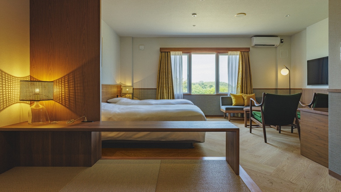 ファミリーやグループ旅行におすすめのお部屋です。畳スペース付き和洋室が使いやすく、ウッド調の落ち着く空間です。※3名さまからは和布団になります。