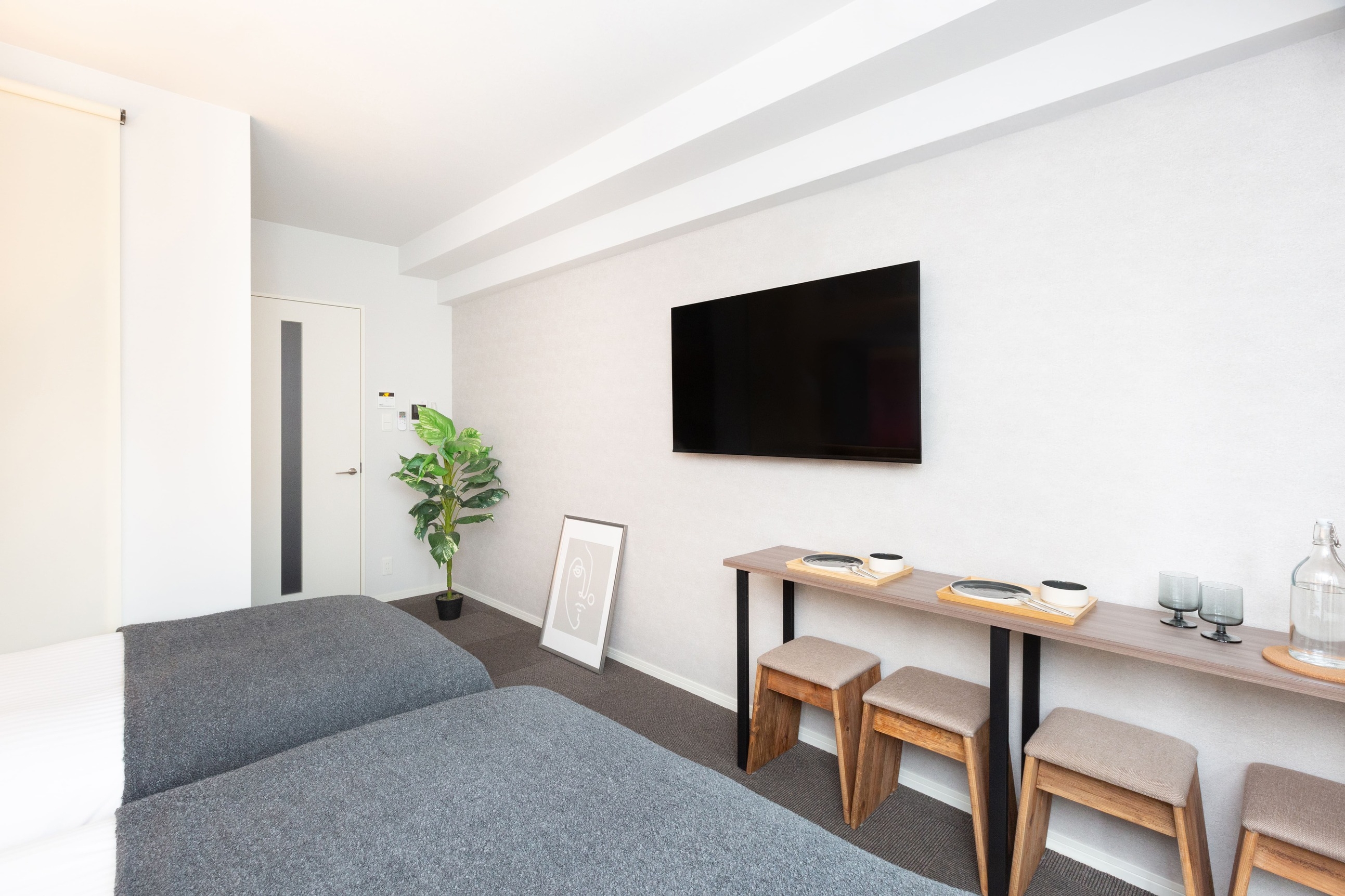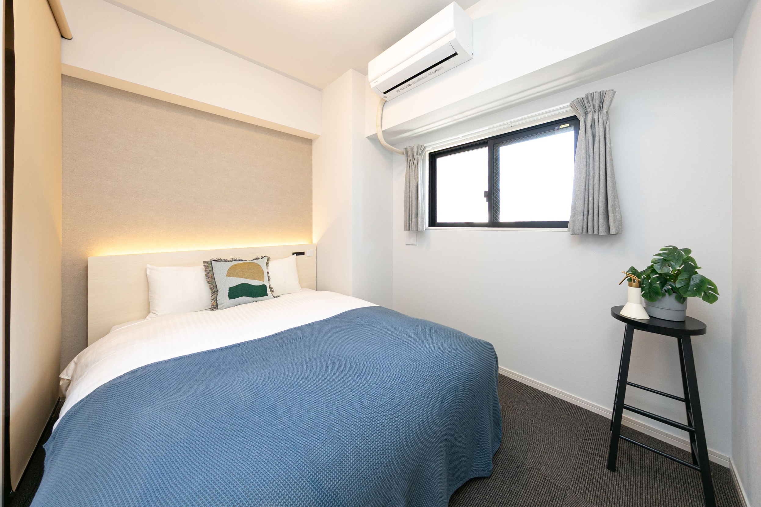 寝室はダブルベッド1台、シングルベッド1台、追加寝具として収納スペースに三つ折りマットレスを完備!