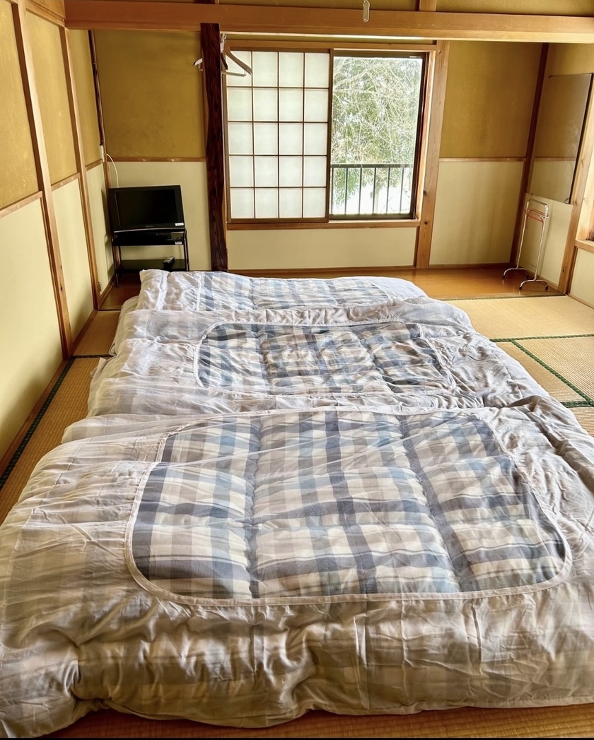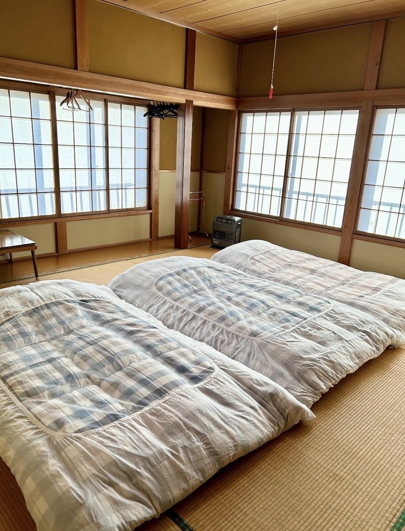 1.和室10畳(布団4個)2.素泊り(歯ブラシタオルは提供なし,シャワールームのシャンプー、ボディソープは提供)3.3歳〜未就学は別3000円かかる(現地支払)