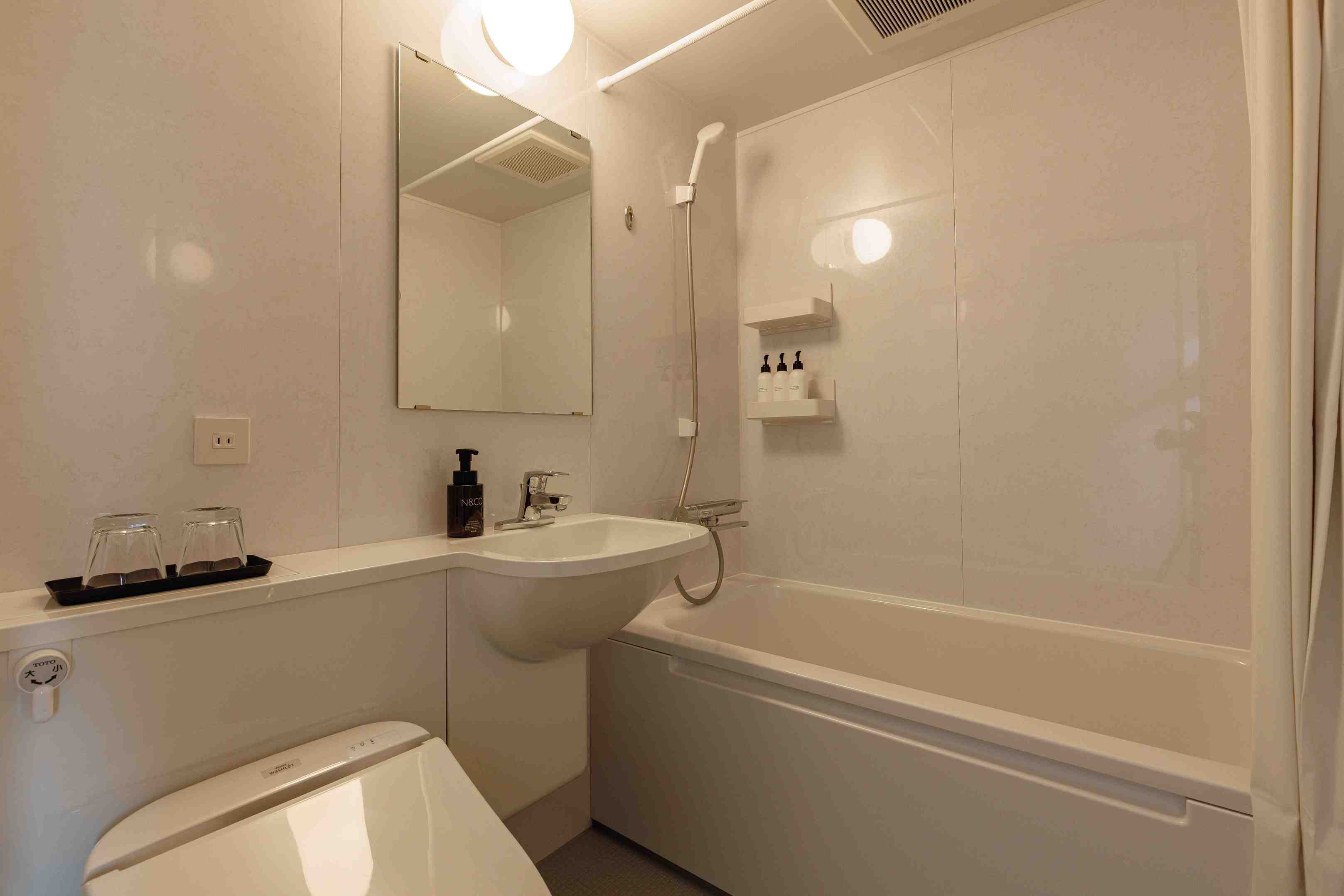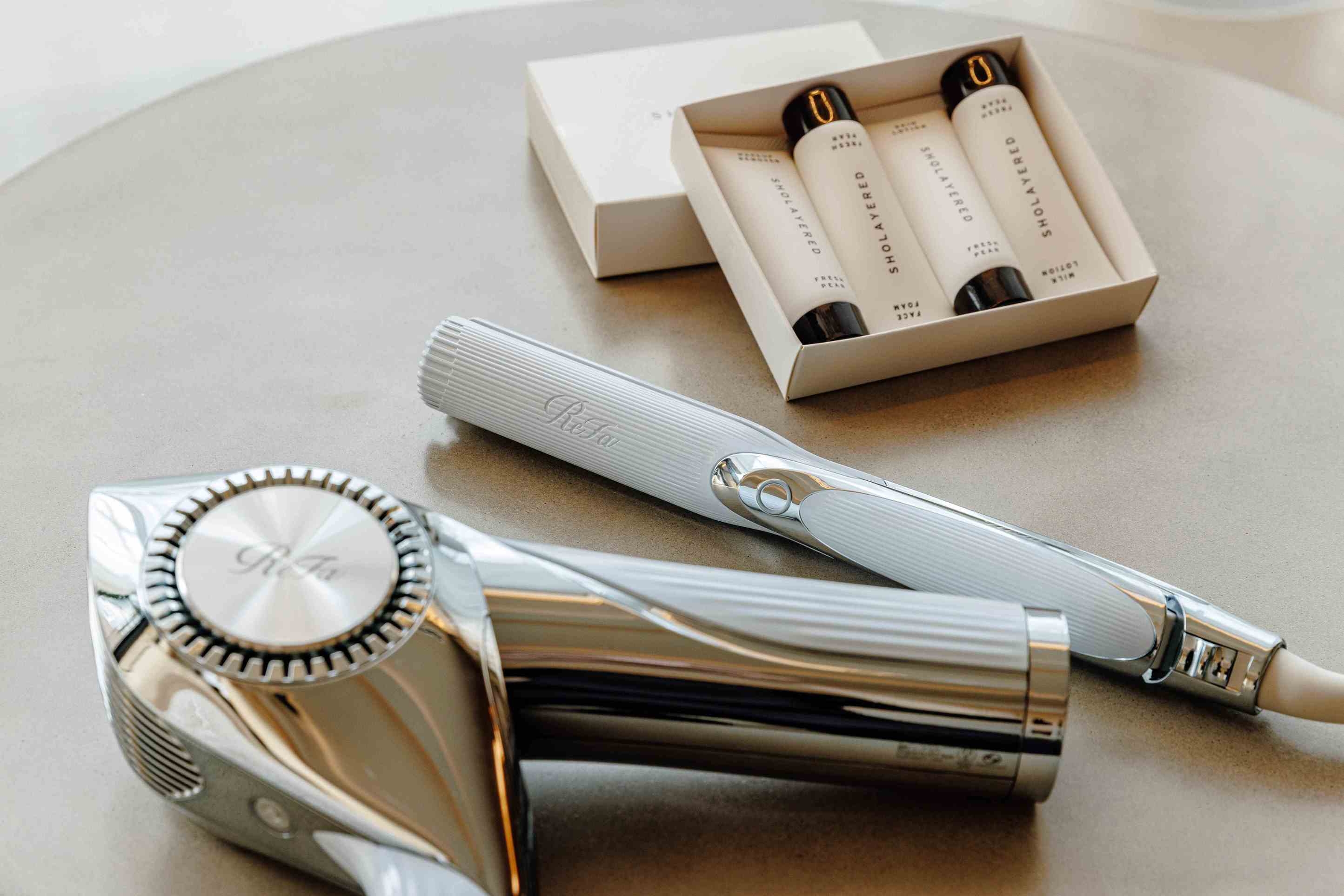「Rifa」のヘアドライヤーとヘアアイロン、シャワーヘッドを設置し「SHOLAYERED]のスキンケアセットをご用意した女性専用のお部屋。景観は町側。
