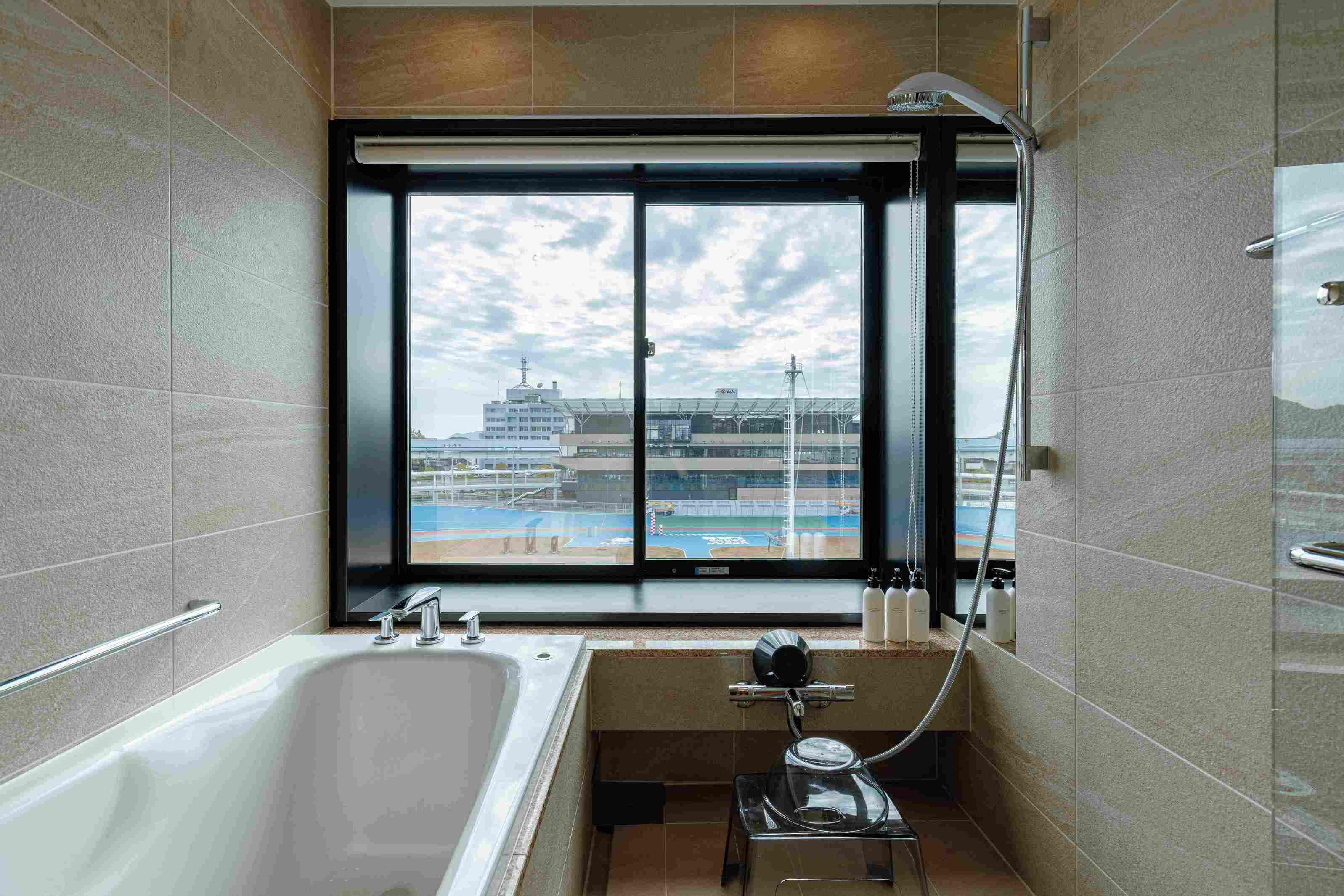 コンパクトながらも機能性を追求し、快適な滞在を提案。 広島競輪場側の景観。