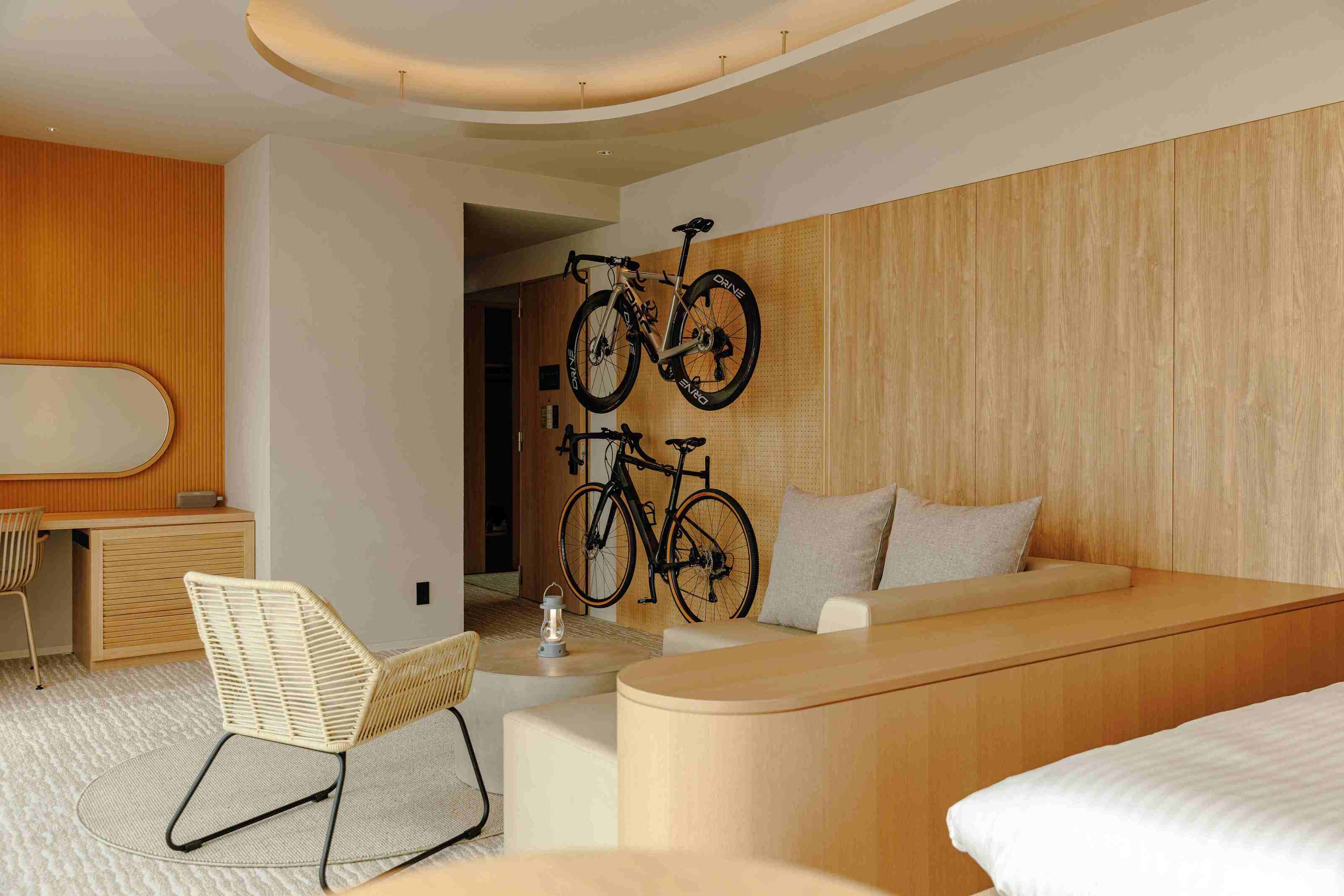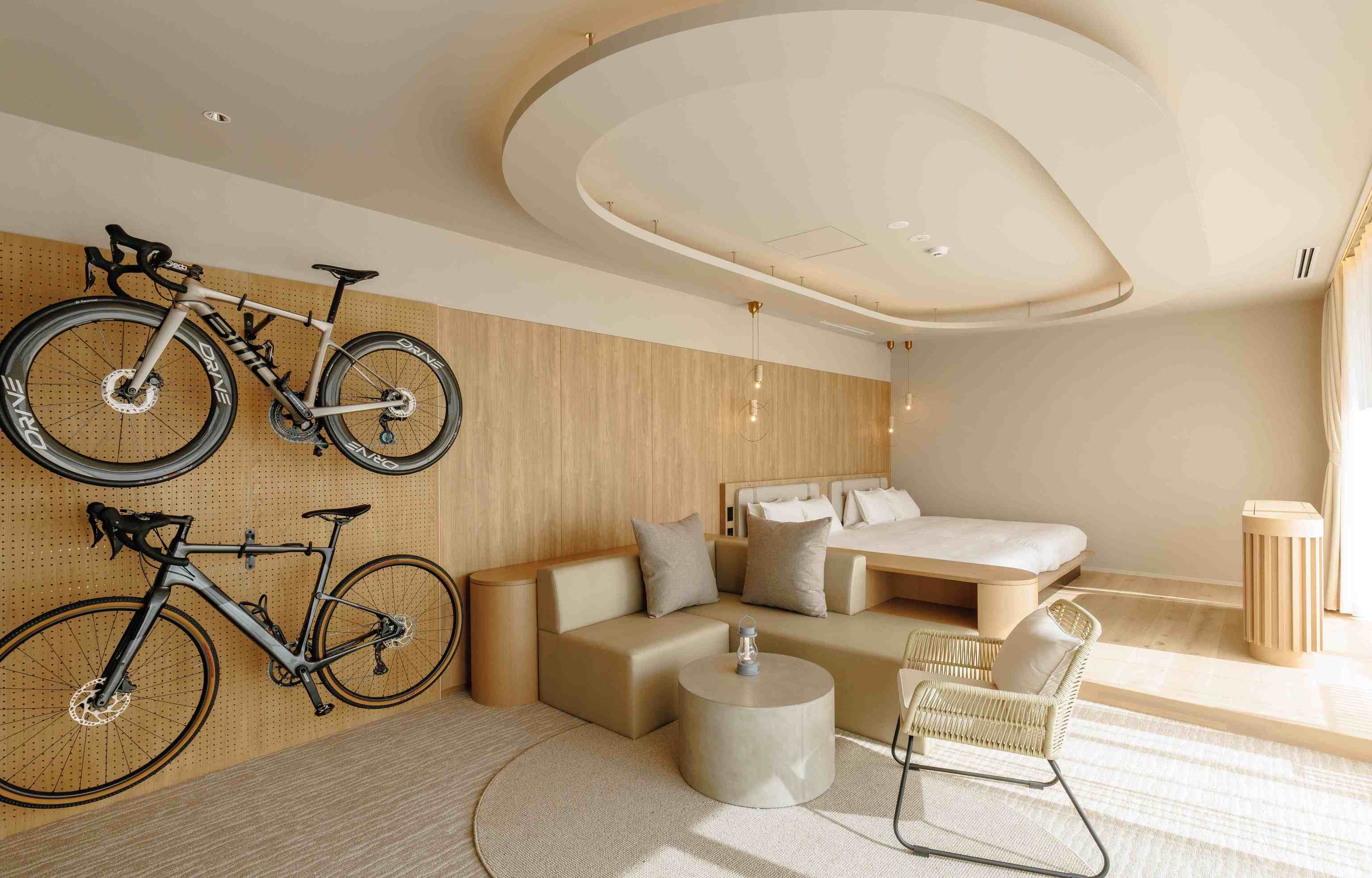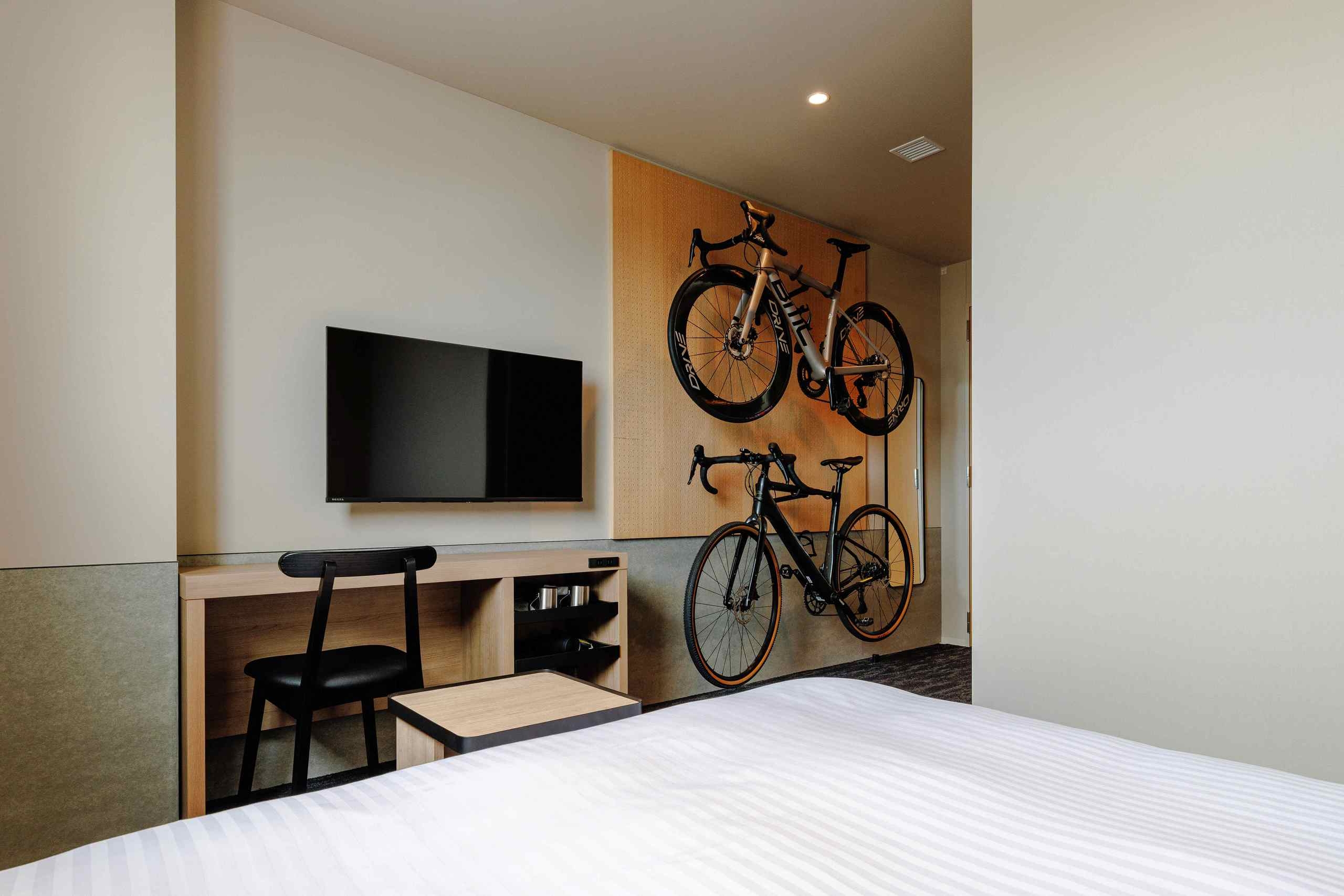 160サイズの大きめのベッドをご用意。バリアフリーの客室で自転車も2台持込可能。お部屋から見える景観は町側。