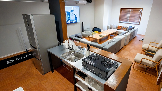 2025年12月、愛媛県松山市立花に、本格的なカラオケやダーツを楽しめる宿がオープン!無印良品の家具で統一された清潔感のあるお部屋で、快適にお過ごしいただけます。松山空港から車で25分。落ち着きのある住宅街に立地し、徒歩圏内にはスーパーや飲食店が点在しています。松山城や銀天街(商店街)へもスムーズにアクセスが可能!観光と日常のバランスがよく、長期滞在にも適した環境です。日本最古の温泉で、歴史ある建築と癒しの湯が魅力の「道後温泉」まで車で約13分。焼き物で有名な砥部町までは車で約20分。夕日の名所の下灘駅までは車で約40分です。主要観光スポットへもアクセスしやすく、愛媛・四国観光の拠点に最適です!宿泊先【1階】玄関キッチン、ダイニング:ダイニングテーブル&チェアキッチン、リビング(カラオケルーム):カラオケ、ダーツ、ソファ、ローテーブル洗面所、トイレ※エキストラベッド4台有【2階】浴室、脱衣所、トイレ寝室1:シングルベッド2台寝室2:シングルベッド2台寝室3:シングルベッド2台寝室4:ダブルベッド1台寝室5:シングルベッド2台独立した5つの寝室は、プライバシーを確保できるため、各々の空間でリラックスした時間を過ごせます。全室エアコン完備で、季節を問わず快適にお過ごしいただけます。1階にエキストラベッド4台をご用意しておりますので、最大14名まで宿泊可能です。大人数のグループ旅行にも最適な広々とした間取りが魅力です。リビング(カラオケルーム)には大人数でも座れる広いソファがあり、ゆったりとくつろげます。85インチの大画面で楽しめるJOYSOUNDカラオケやDARTSLIVEのダーツセットを完備!皆様で盛り上がれる特別なひとときをご提供いたします。カラオケシステムには外国語の楽曲が豊富に揃っていますので、様々な国の方々に楽しんでいただけるでしょう。鬼滅の刃(竈門炭次郎・煉獄杏寿郎・胡蝶しのぶ)のコスプレ、チャイナドレス、袴も用意しているのでぜひお楽しみください!駐車場は近隣の駐車場で、2台分無料でご用意しております。