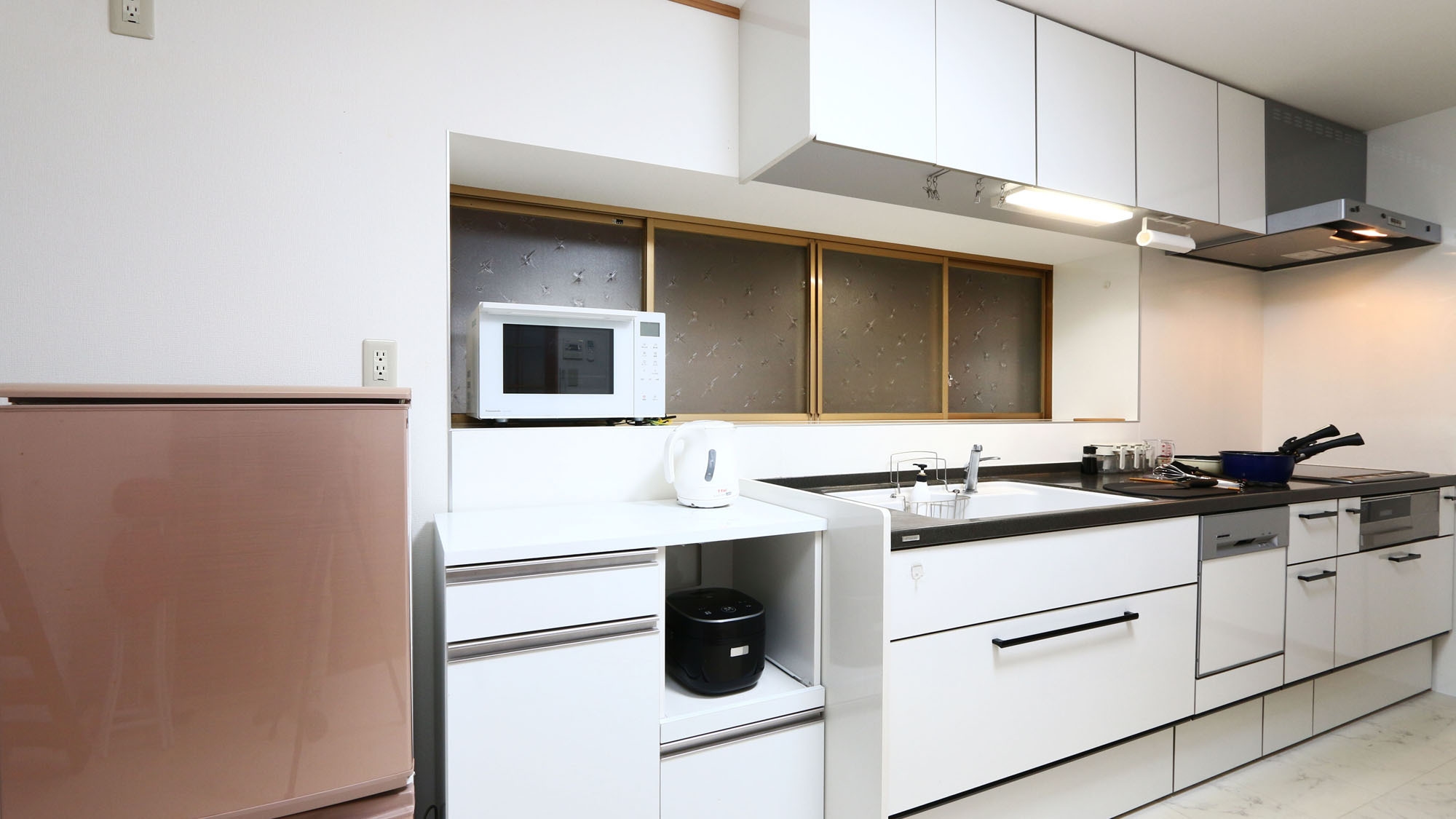 3口IHコンロや電子レンジ、冷蔵庫、湯沸かしポット、炊飯器、