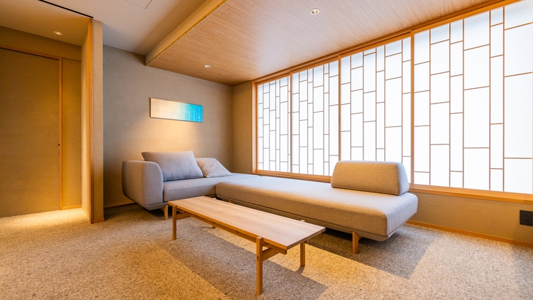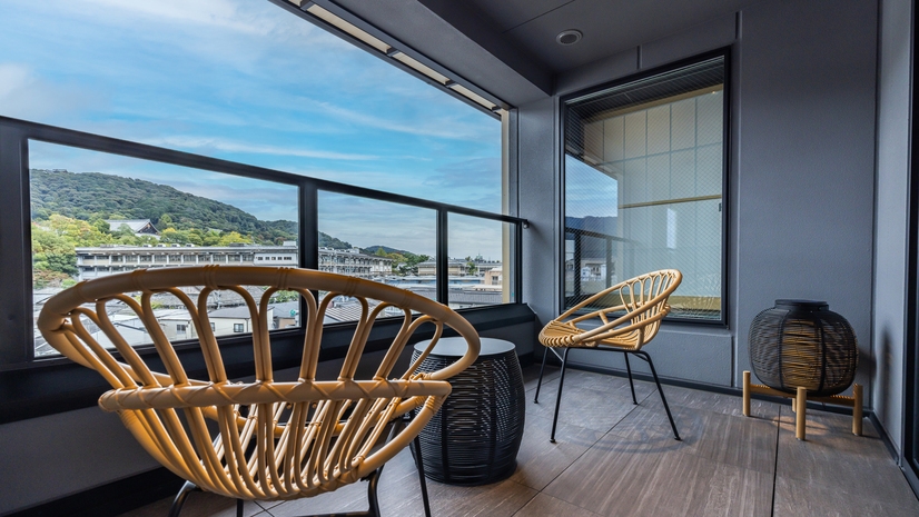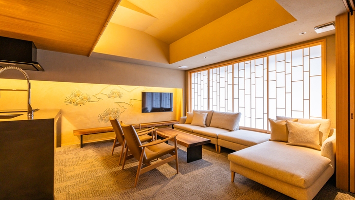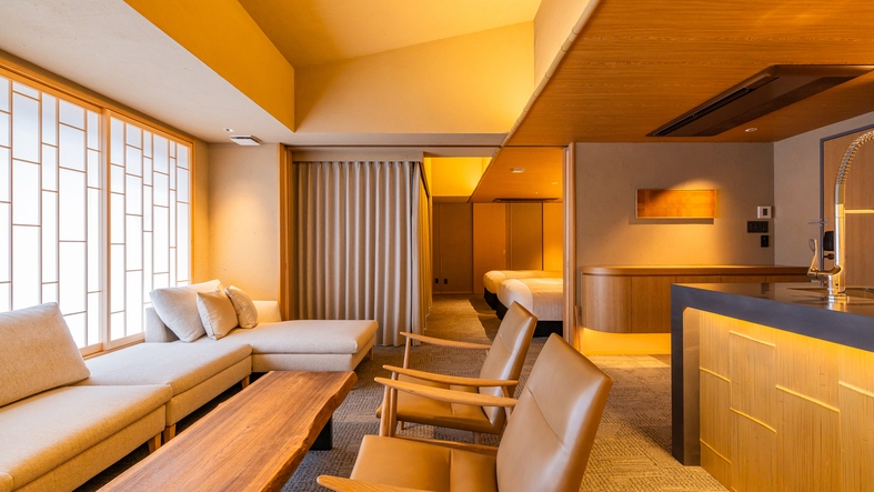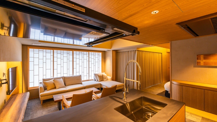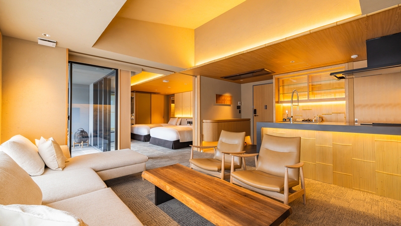 2ダブルベッド+ソファ/ 和室・リビング・テラス付。最上階ワンフロア貸切の最大4名様までご滞在いただける、テラスとリビングキッチンを備えた特別な一室。