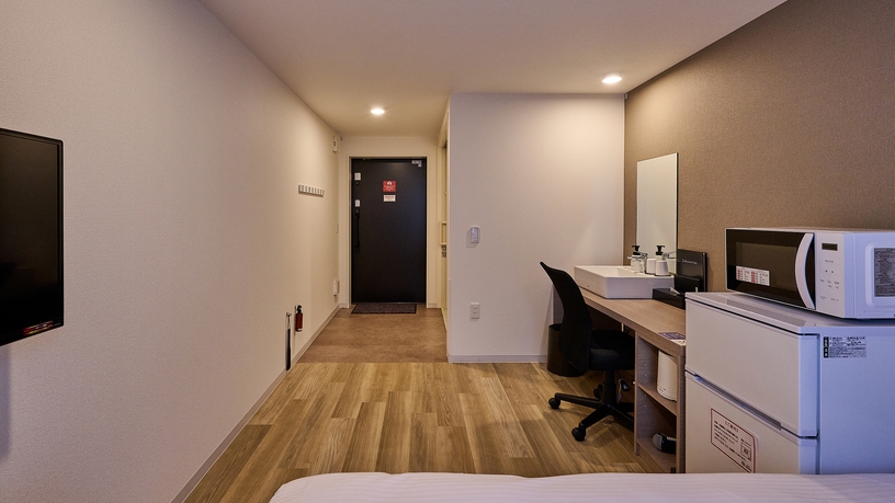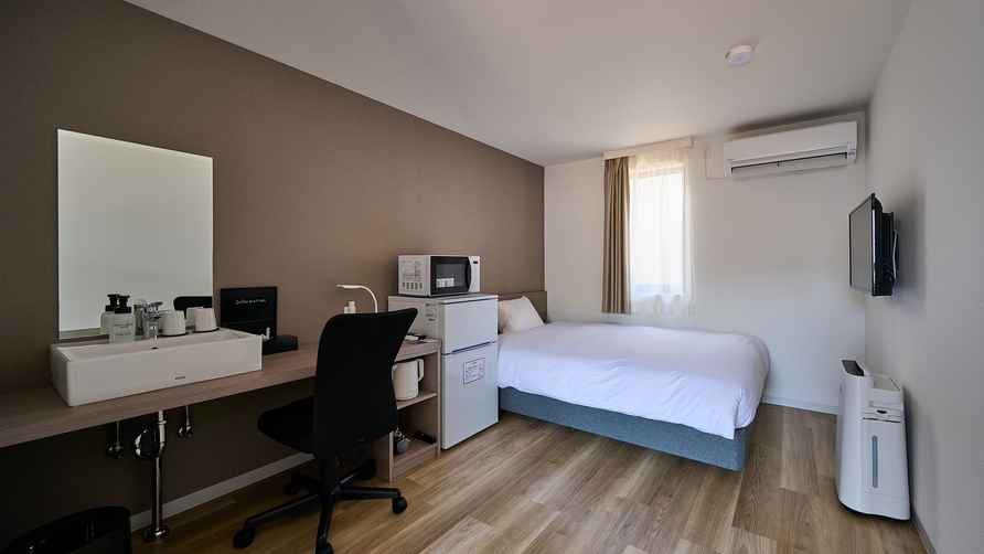 シモンズ製ダブルベッド(W140×L195サイズ)1台を完備。TV・デスク・チェア・冷凍冷蔵庫・電子レンジを備えておりますので連泊でも快適◎