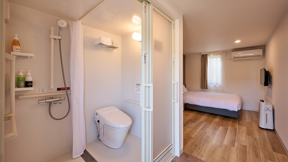 シモンズ製ダブルベッド(W140×L195サイズ)1台を完備。幅広い年代の方や車いすをご利用の方にも快適にお過ごしいただける、バリアフリー対応のお部屋です。