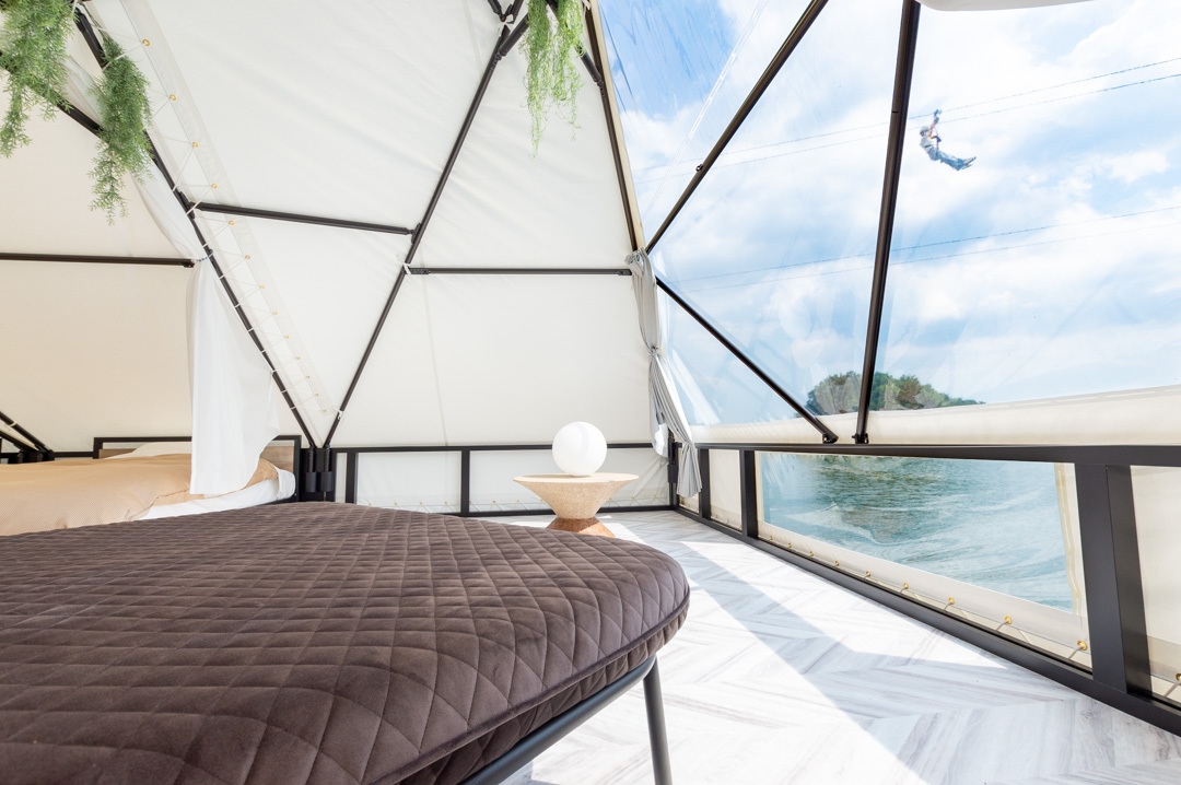 日本初!湖の上に浮かぶ船のようなグランピング 夏季に開催される花火大会では、だれよりも花火から近いお部屋の中から、打上花火があがる夜空を観賞することができます