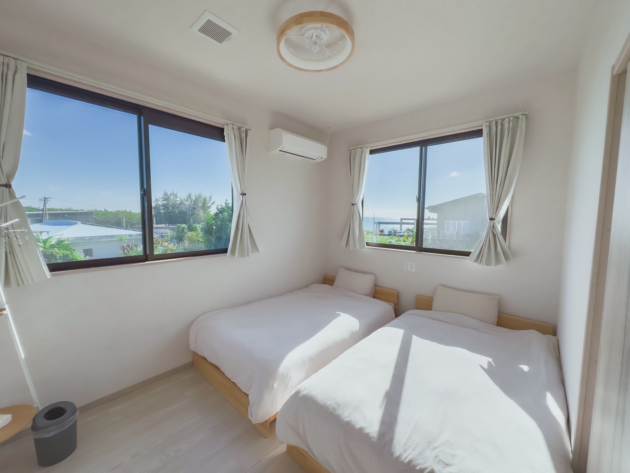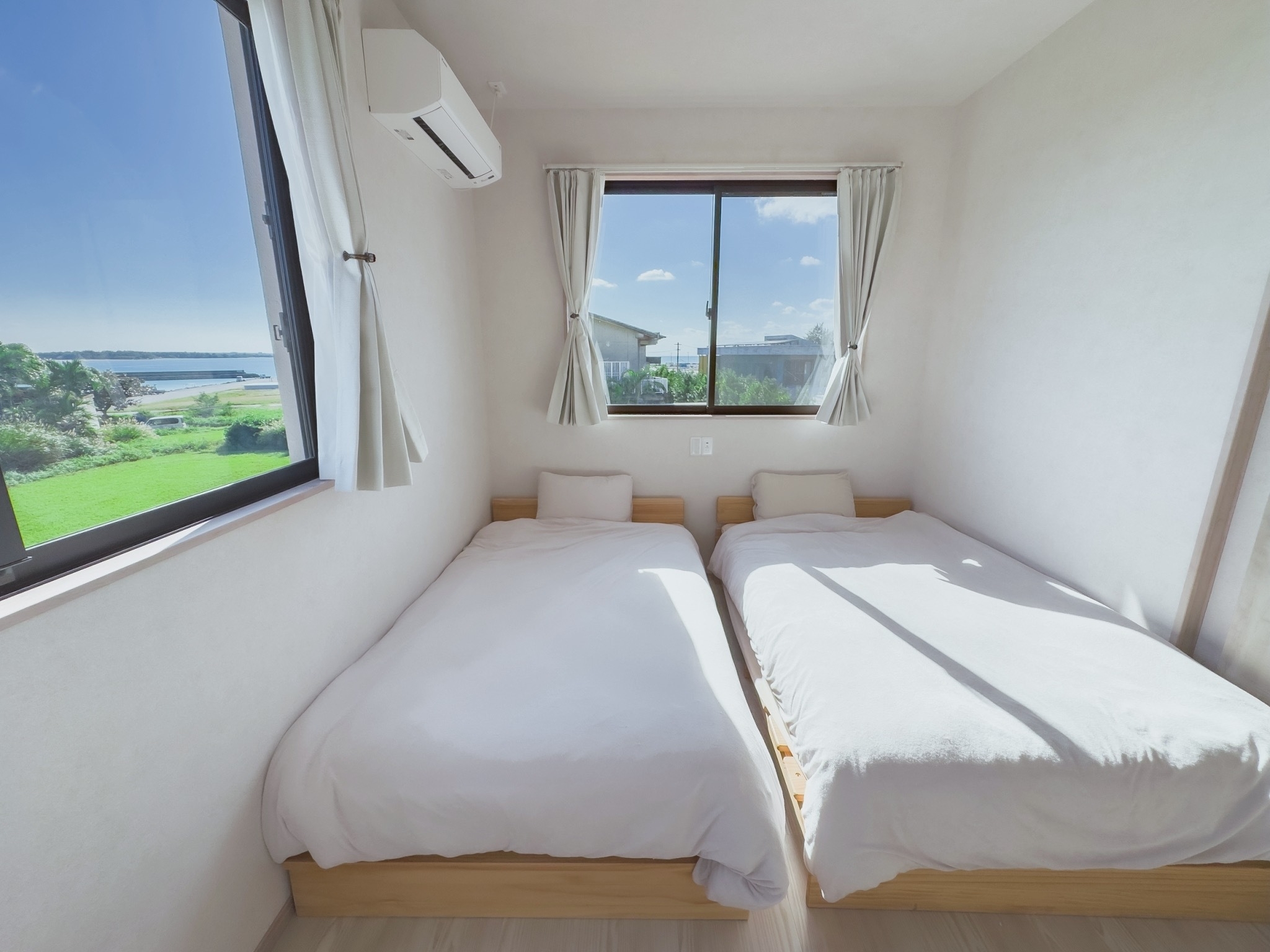 海の見えるセミダブルのツインルームです。ご家族や少人数グループでゆったり過ごせます。添い寝のお子様用の寝具はございませんがキッズ枕はご用意ございます。