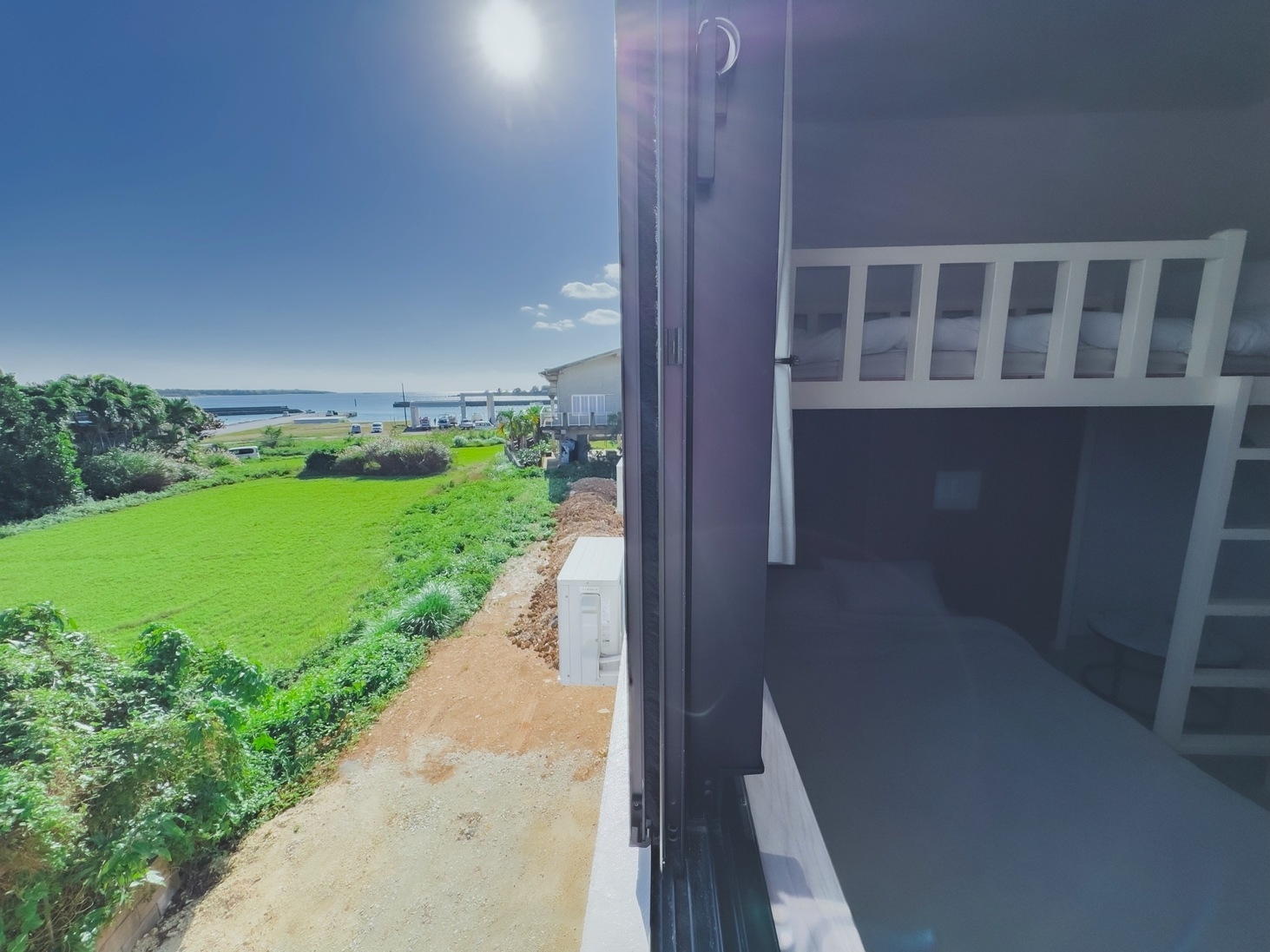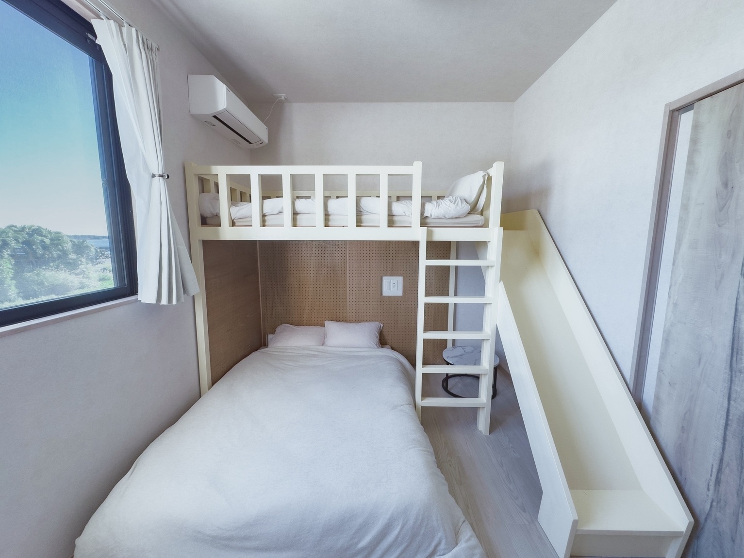 少し海の見えるファミリールームです。ご家族ででゆったり過ごせます。添い寝のお子様用の寝具はございませんがキッズ枕はご用意ございます。