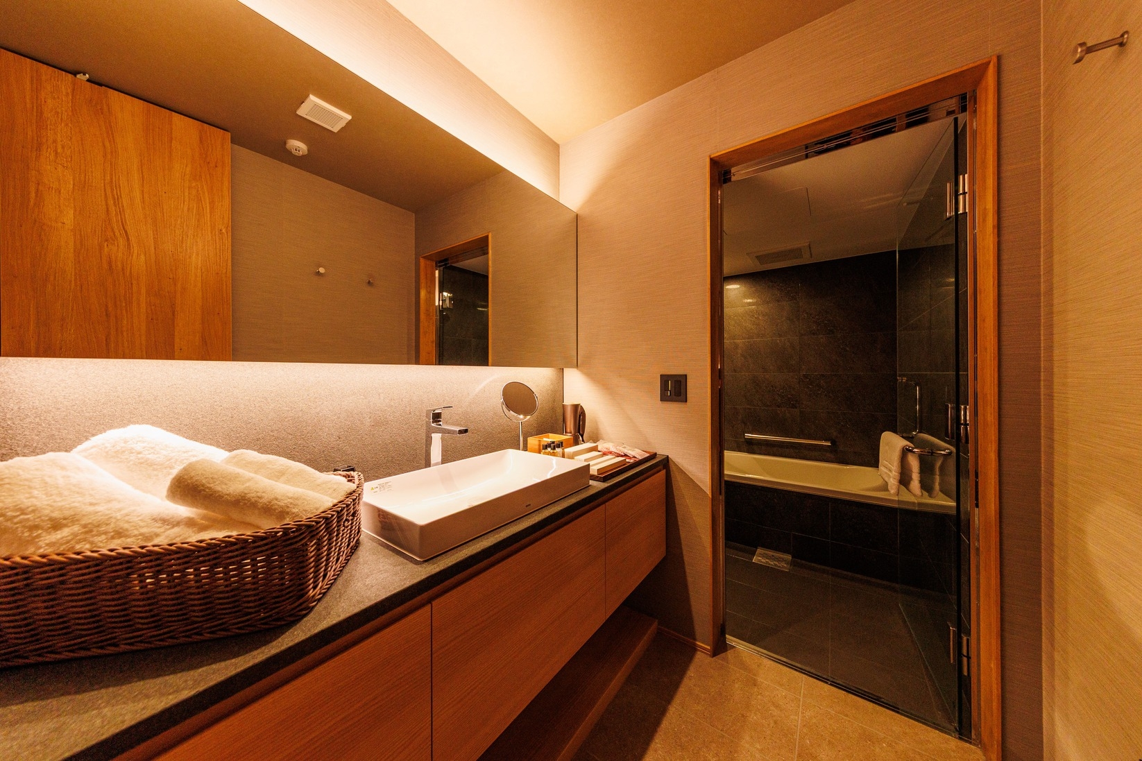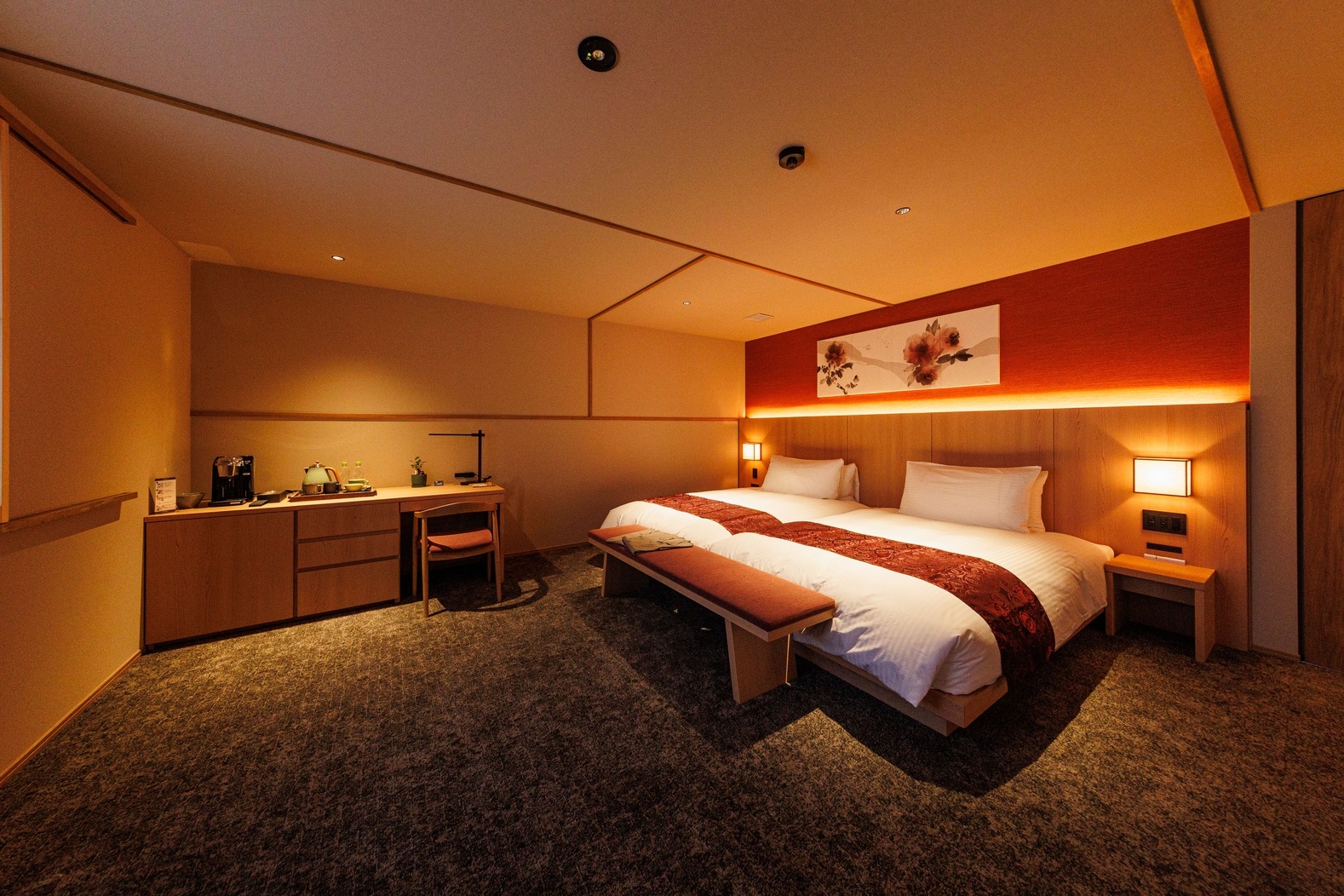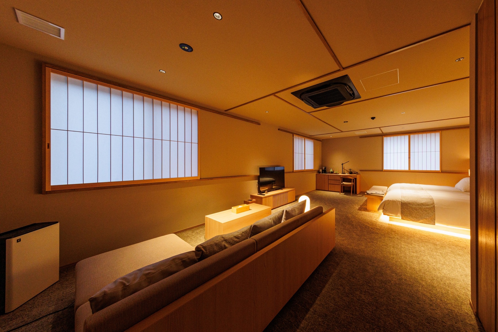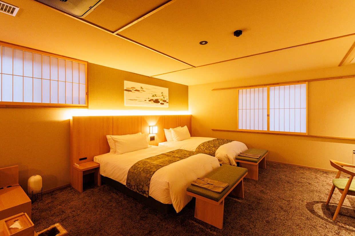 大きな窓の外には、日本伝統の専用の箱庭が広がる和モダンで洗練されたお部屋です。高級ベッドのシモンズと高品質のアメニティ・今治の高級タオルを備えてございます。