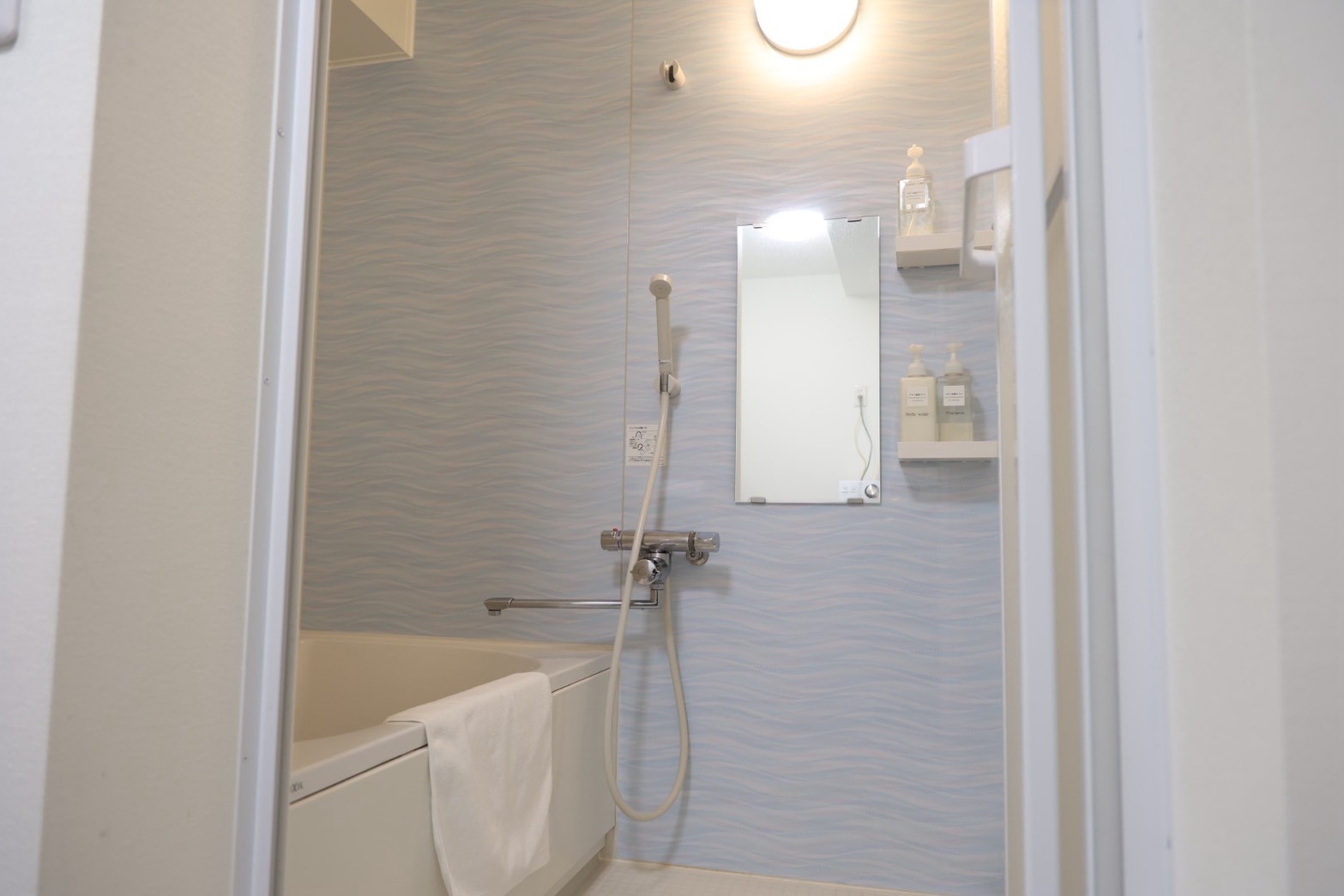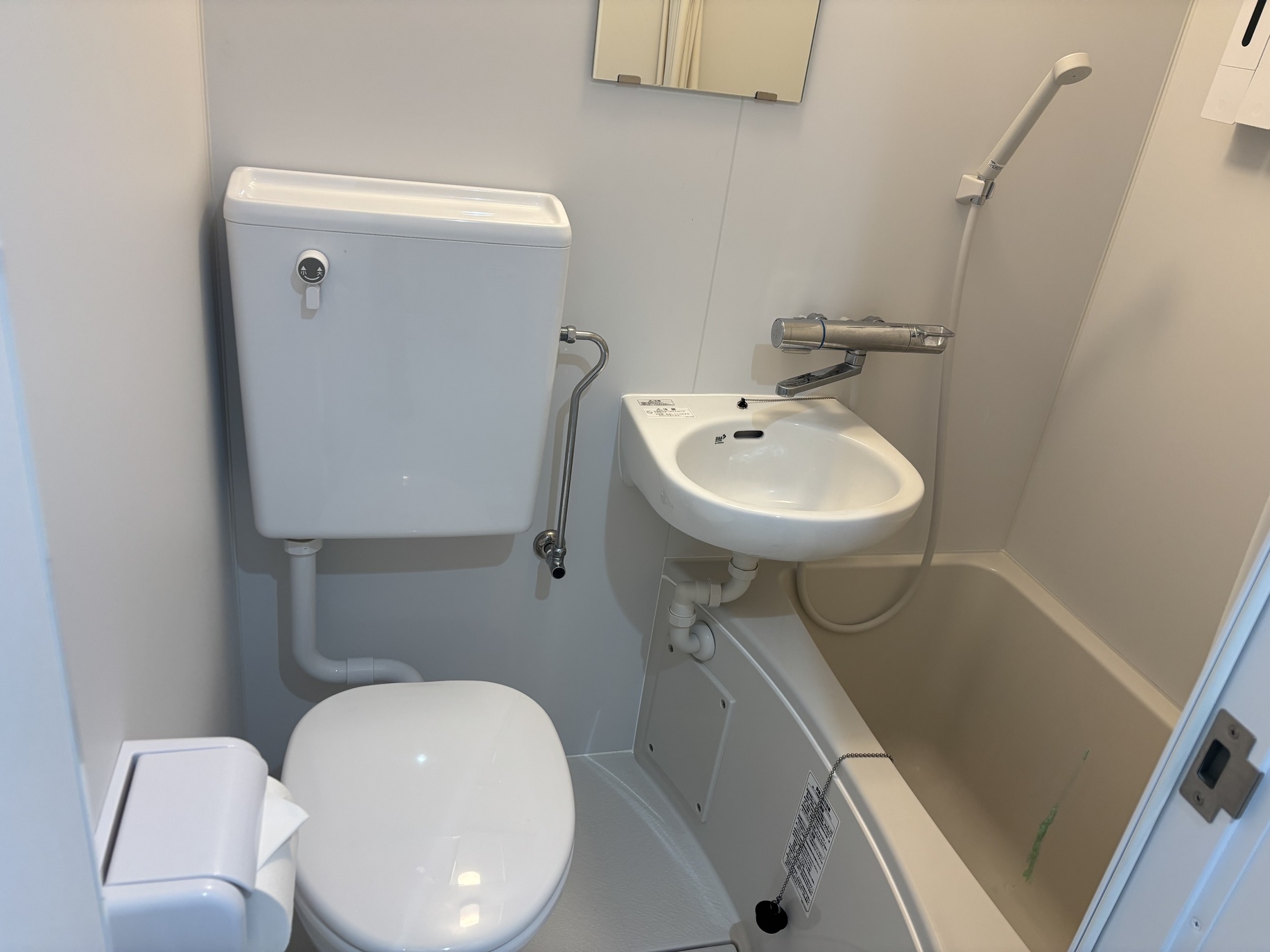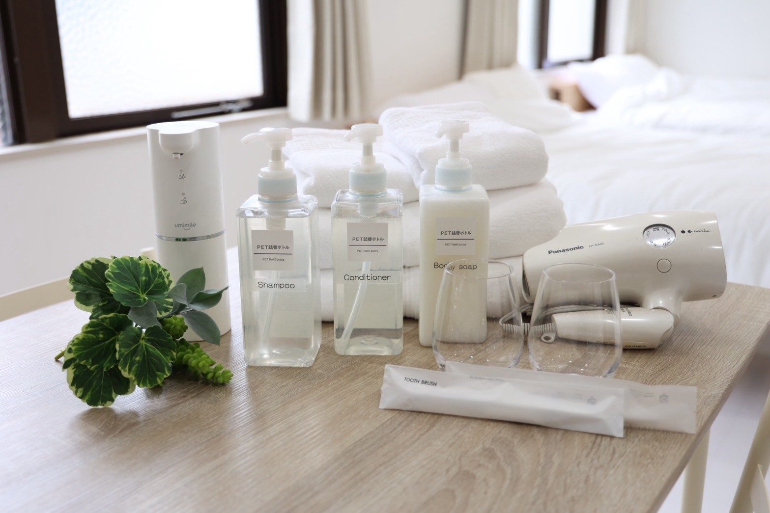共有洗濯機(無料)、ドライヤー、シャンプー、ボディーソープ、バスタオル、歯ブラシを完備し、無料Wi-Fi、地上・BSデジタルテレビ、温水洗浄便座も備えています。