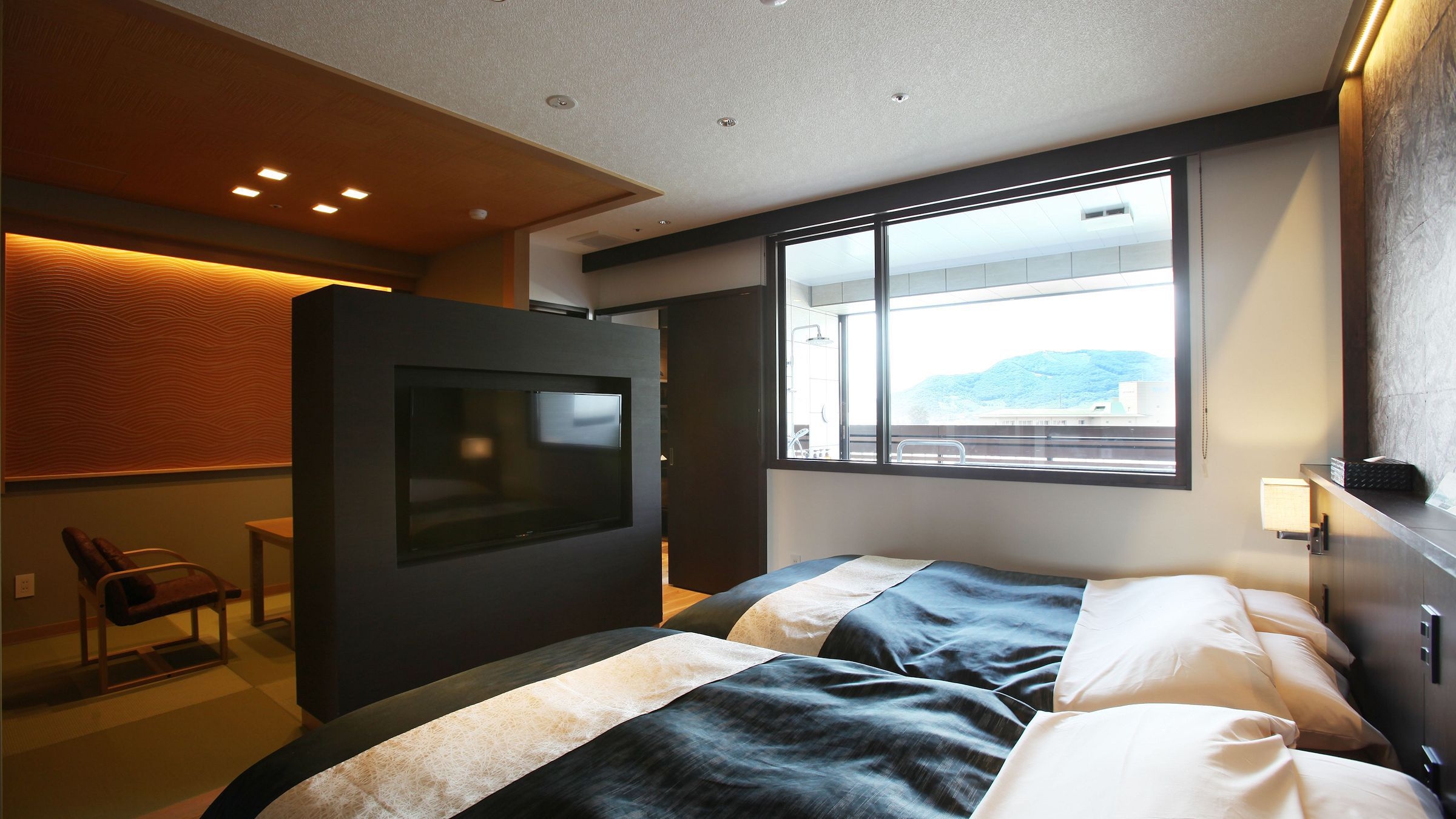 露天風呂・サウナ付特別室〜和〜(なごみ)和洋室(リビング+2ベッド+6畳/2〜4名様定員)和みの空間で癒されながら、至福の時間をご堪能ください。◆客室露天風呂(浴槽定員:2名様、眺望:山)客室露天風呂は自家源泉100%かけ流し(加水・加温なし)となっております。内風呂はございません。当館の客室露天風呂は三面壁・天井あり、一面窓での開閉可能な客室露天風呂となります。◆サウナ・水風呂ロウリュもお楽しみいただける本格的なサウナとなります。◆リビング(18.2㎡)+洋室(13.8㎡)+和室(6畳)皆さまでゆったりと過ごせるリビング、2ベッドの落ち着いた洋室、畳の上でのんびりとくつろげる和室の3部屋となります。客室は禁煙となりますが、客室内に喫煙室がございます。洋室ベッド高さ:44〜50cm◎ 3名様以上(お布団利用のお子様含む)1室でご利用のお客様へのご案内 ◎洋室は2ベッドまで和室はお布団2組までとなりますため、2部屋にわかれてのご就寝となります。洋室・和室ともに内側からの施錠が可能となっております。脱衣所も内側からの施錠が可能ですので、ご夫婦2組様1室などでのご利用も可能となります。●夕食 【個室にて和会席】食前酒には山梨県産100%グラスワイン(20歳以上の方のみ)、やわらかい肉質・鮮やかな肉色・豊かな風味の舌ざわりの「甲州牛」ステーキ(50g)、甲州名物特選ほうとうなど地場の素材・旬の食材をふんだんに使ったこだわりお料理の数々をお楽しみください。 ※大人の方の場合☆ご希望のお客様は夕食内容の変更(無料)も可能となります。 ※大人の方のみ【板前割烹「昌」にて旬彩懐石】 ※グループ毎に変更可能【牛鉄板焼処「千」にてステーキ懐石】 ※グループ毎に変更可能【個室にて<特選活うなぎ御膳>】 ※1名様より変更可能※ご希望のお客様はご宿泊日の4日前までに宿までご連絡をお願いいたします。※お子様同伴など状況によっては変更不可となる場合がございます。予めご了承ください。●朝食 【個室にて和食】または【個室にて洋食】または【レストランにてバイキング】※事前orチェックイン時にお選びいただけます。※お料理・お部屋などのお写真は全てイメージ・一例となります。