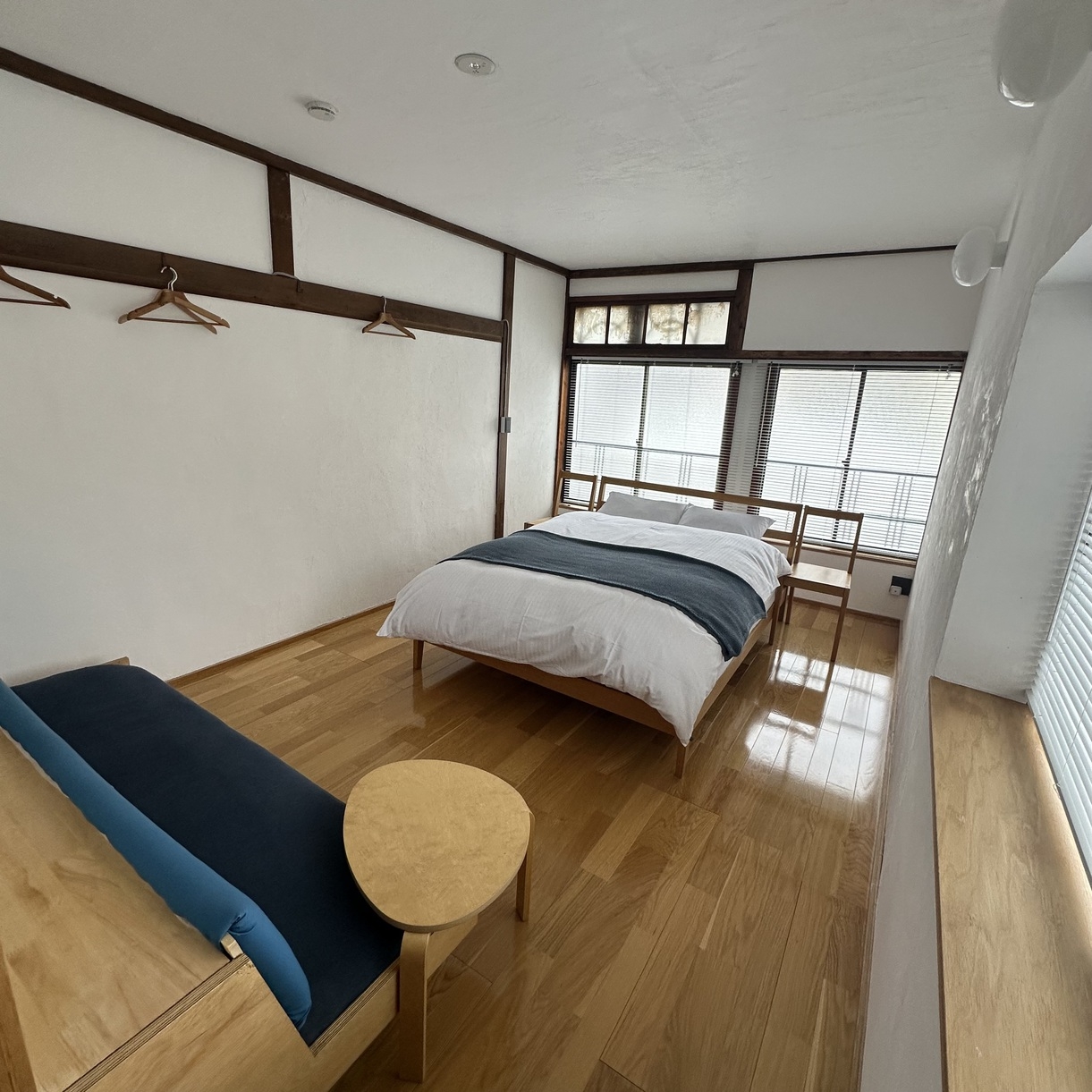 ダブルベッドとソファベッドの洋室。解体、床張り、漆喰塗り、ソファベッド制作などDIY感あふれるお部屋