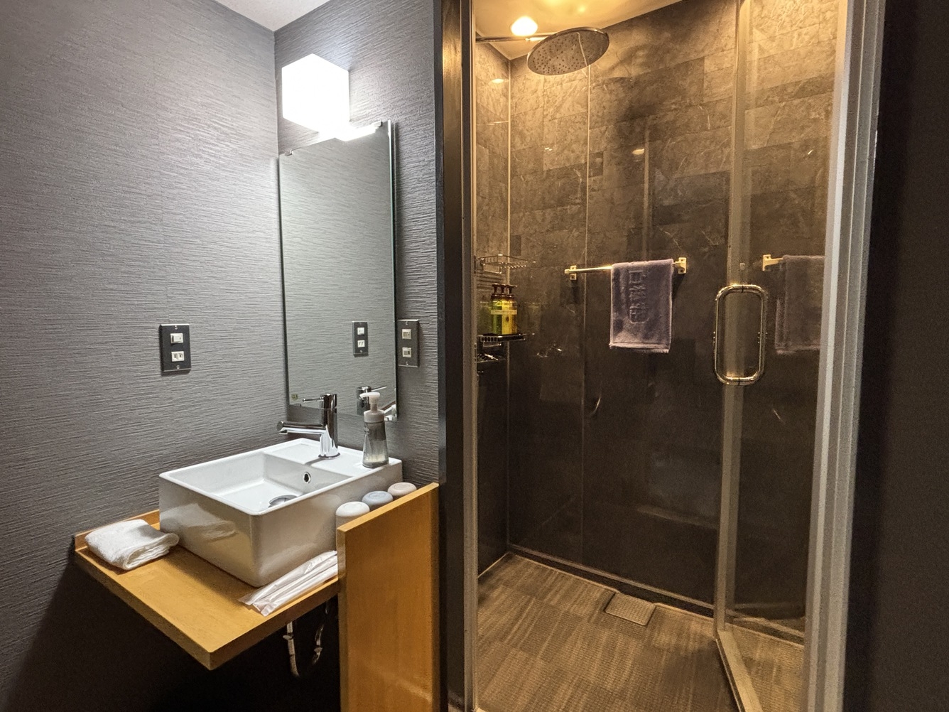 シャワーブース付きですが、バスタブはございません。冷房設備はございません。