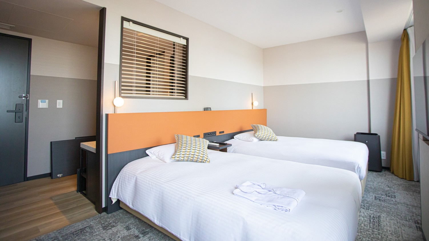 24平米のスタンダードなジャグジーバス付ツインルーム。広々とした空間に幅が広めのセミダブルのシモンズ社製ベッドが2台。