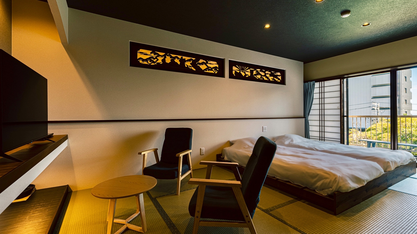 和モダンベットルーム(丸八真綿特注ベット)に露天風呂を配した心と身体を癒すプチスイート。