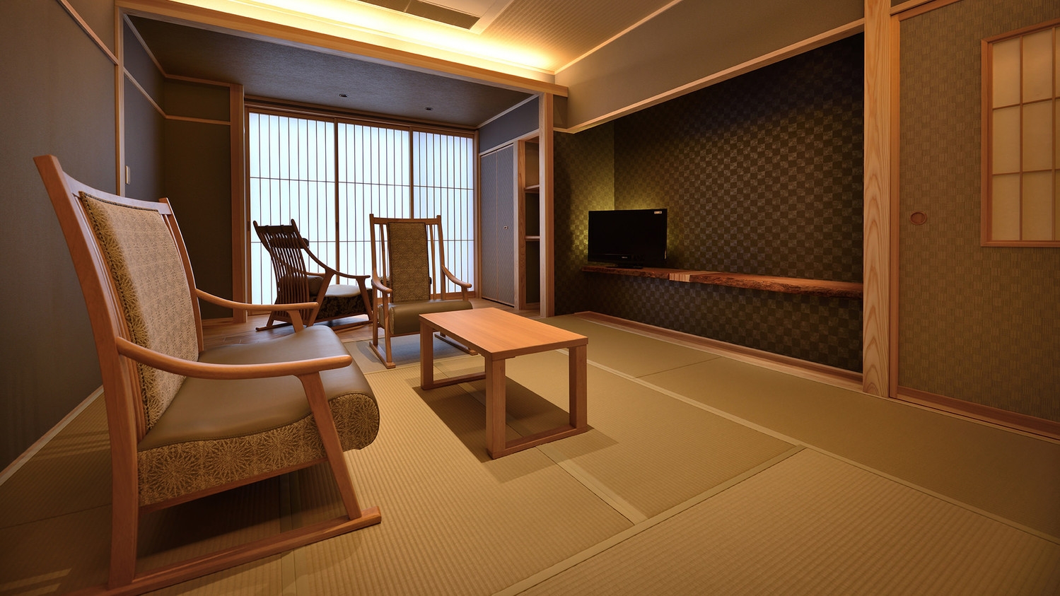 源泉掛け流し100%の温泉を心ゆくまで楽しめる半露天風呂付き客室。和の趣と洋の快適さを備えた木の温もり溢れる和洋室。(シモンズ社ベッド2台、禁煙、1階)