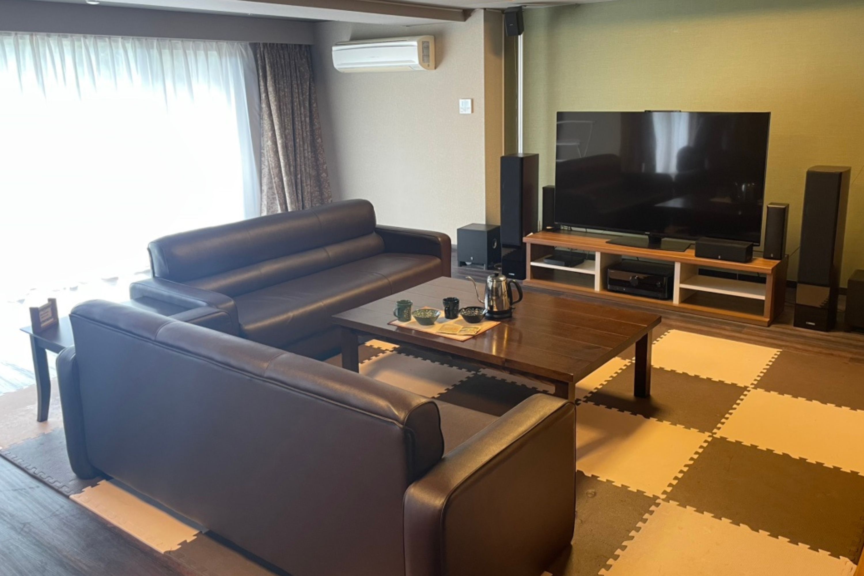 1室限定のサウンドシステムとDVD付テレビ。マッサージチェア、ダイニングテーブル、ベッドは特注2,400mmの特大サイズ