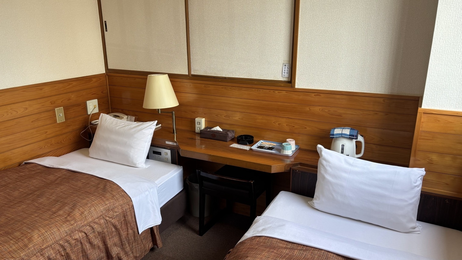 バストイレ付き ベッドが二つのシンプルなお部屋です。