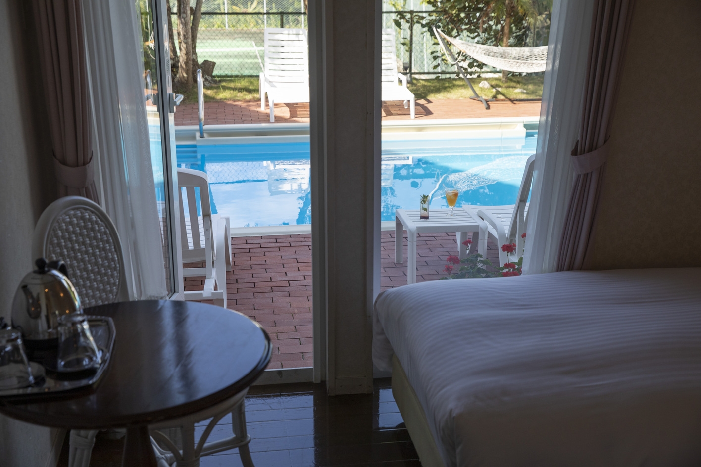 1階のガーデンプールサイドのお部屋です。お部屋から直接プールへ出られます。※お受入は中学生以上の方からです