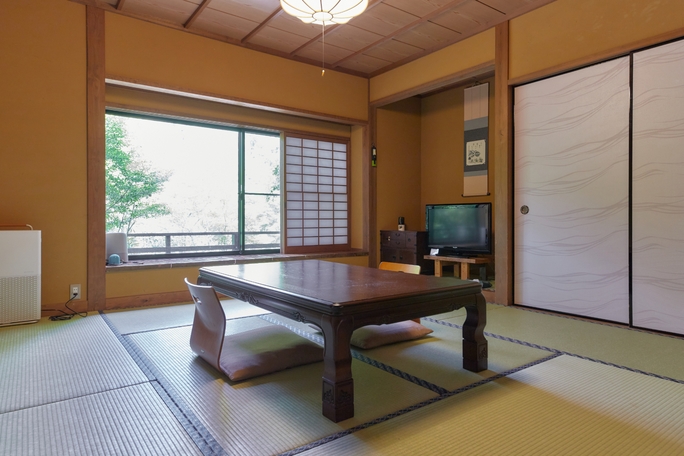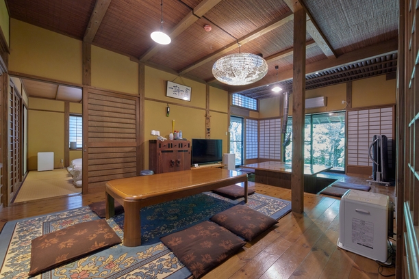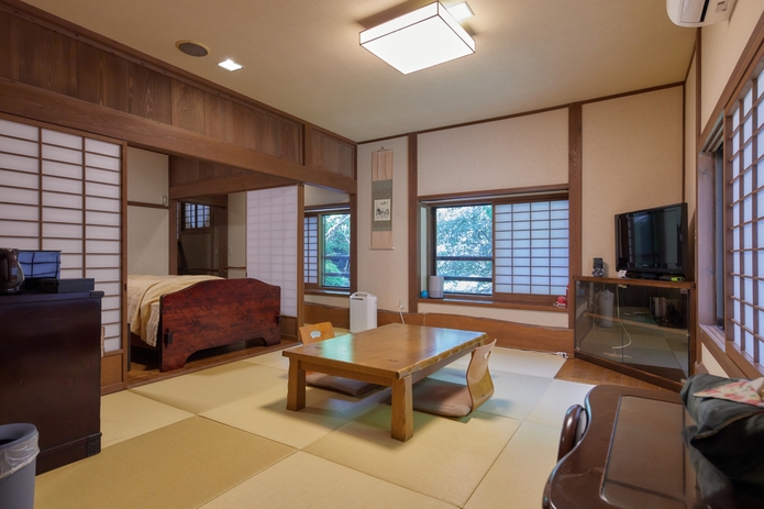 和室8畳が二間連なった広々空間。源泉かけ流しの露天風呂付きの客室。wifi無料