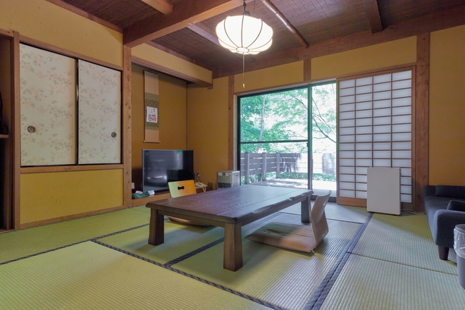 和室8畳一間、二人でゆっくり過ごす趣きの在る空間。檜の内湯付き(源泉かけ流し)wifi無料