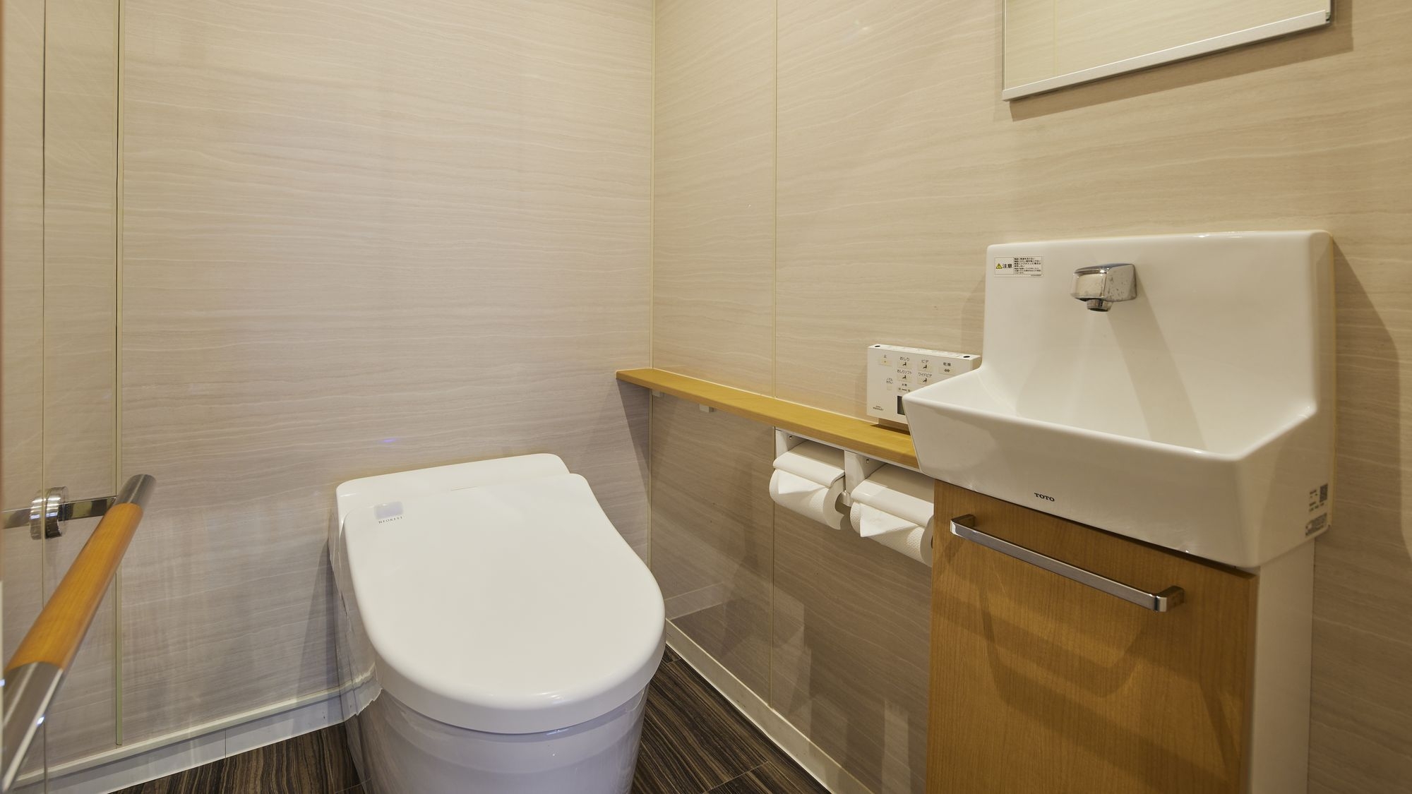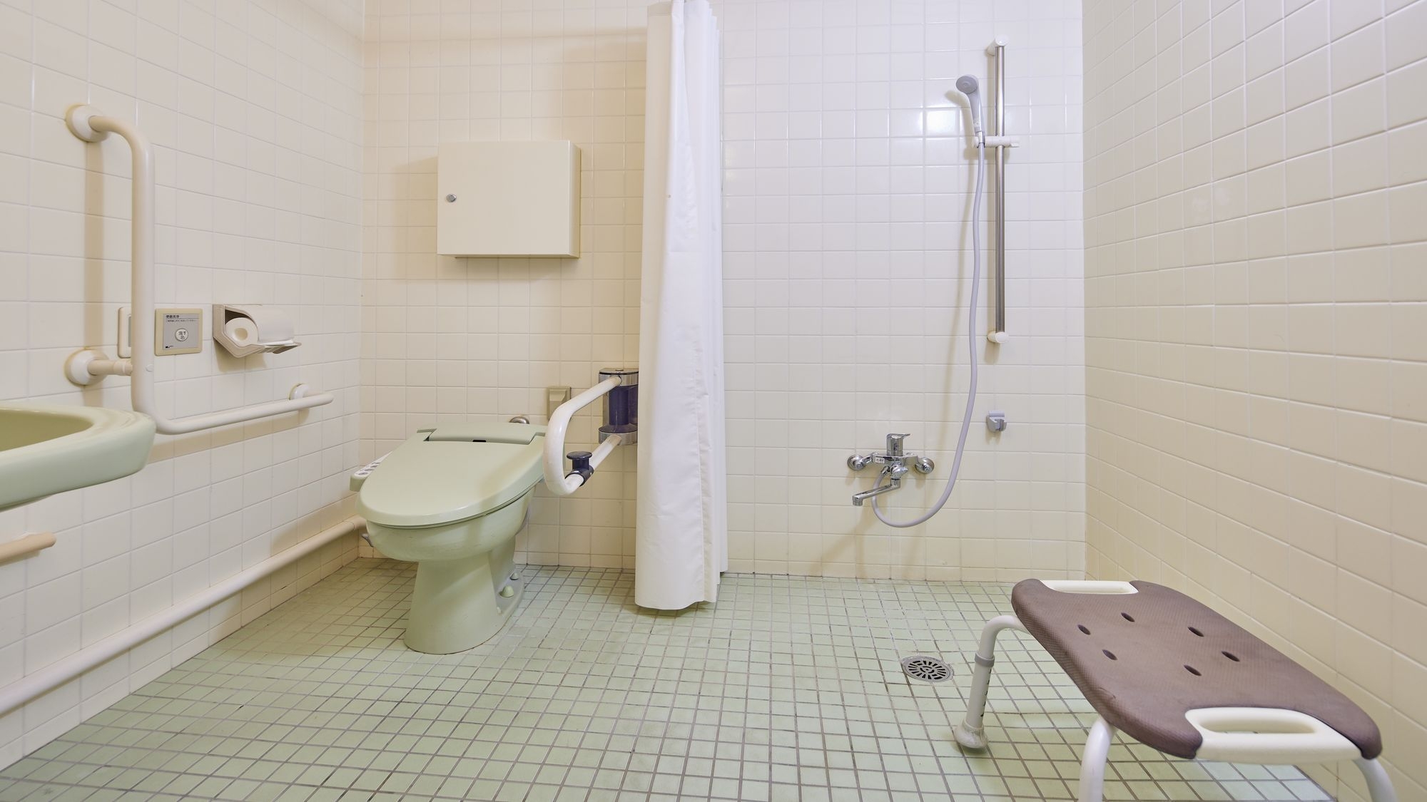 ベッドサイドまで車いすが入る広々としたベッド間隔。バリアフリーで安心してご利用いただけるシャワールームを備えたお部屋です。
