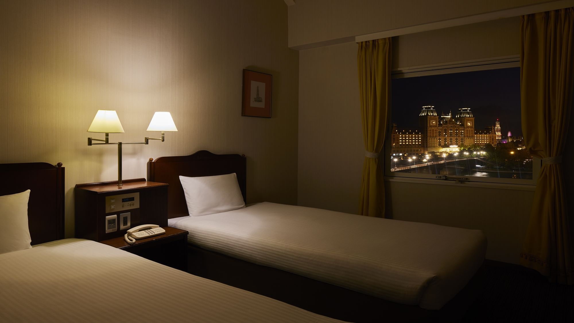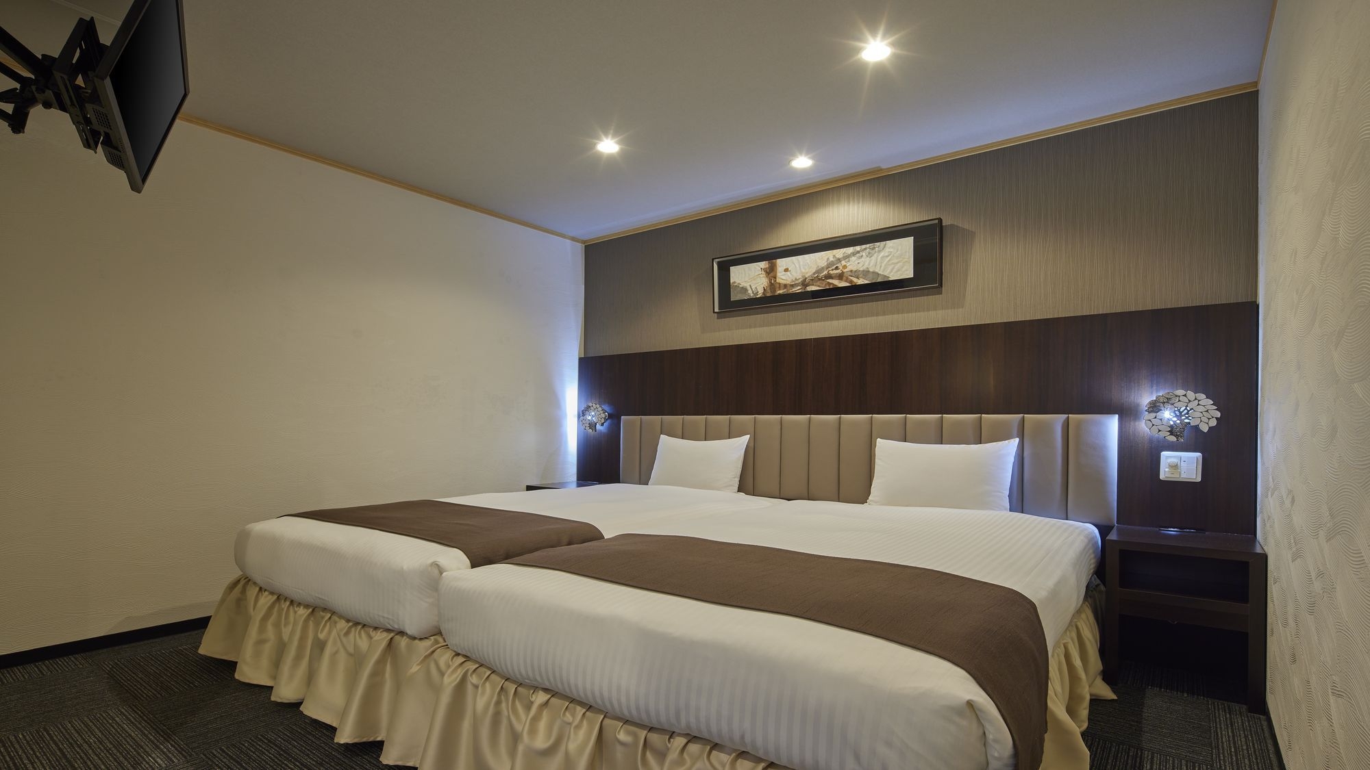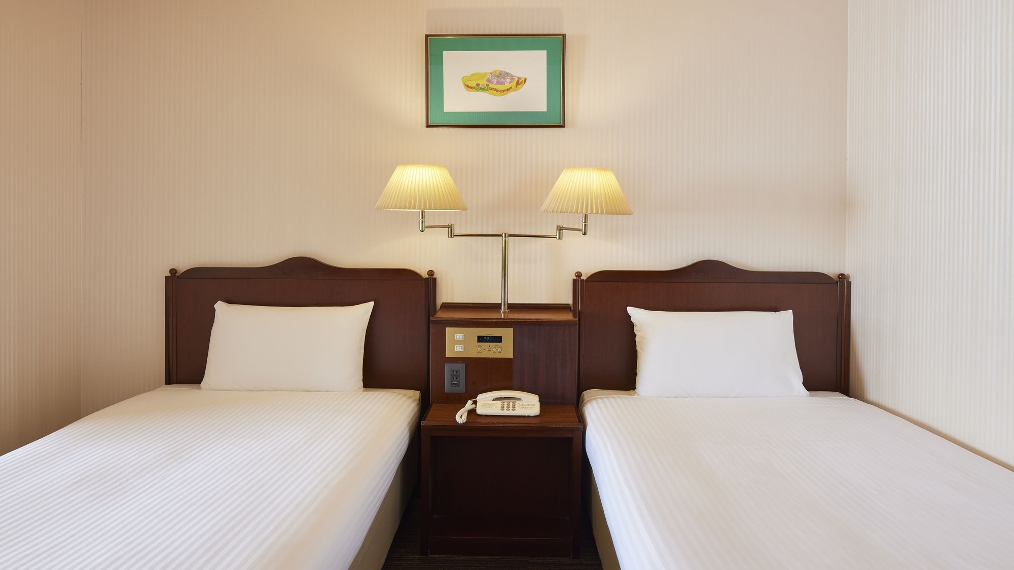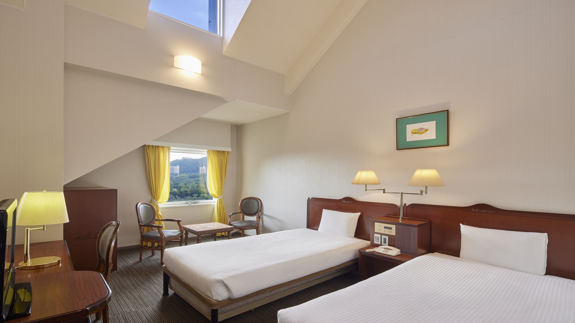天井が高く開放感あふれ、ゆったりくつろげるツインルームのお部屋です。 小学生添い寝2名まで可能。
