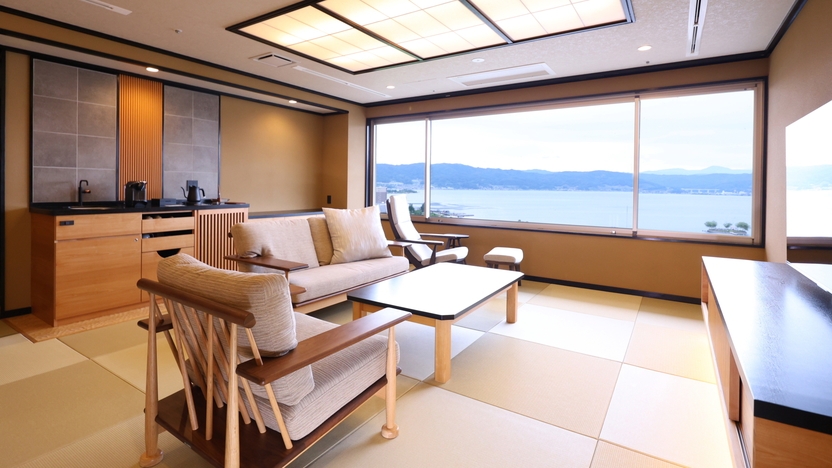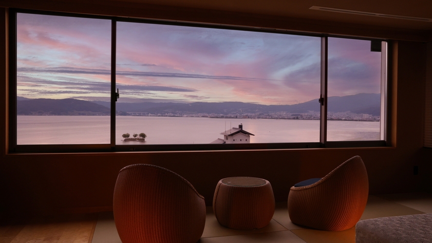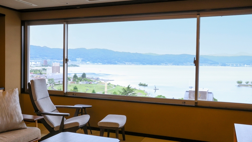 諏訪湖一望フロアに位置する和室。窓の向こうに広がる諏訪湖ビューとともに、ごゆっくりとお寛ぎください。■諏訪湖一望フロア/10〜11階