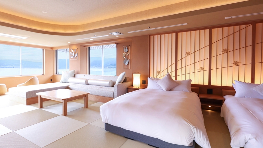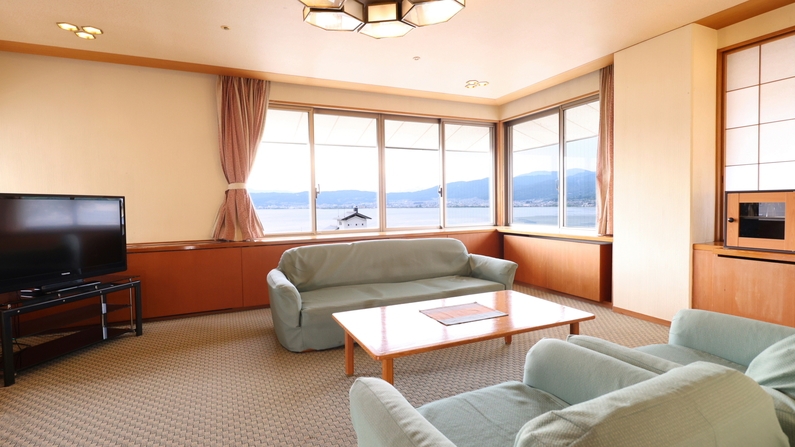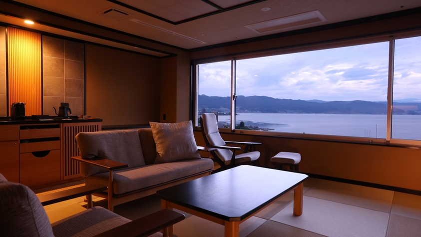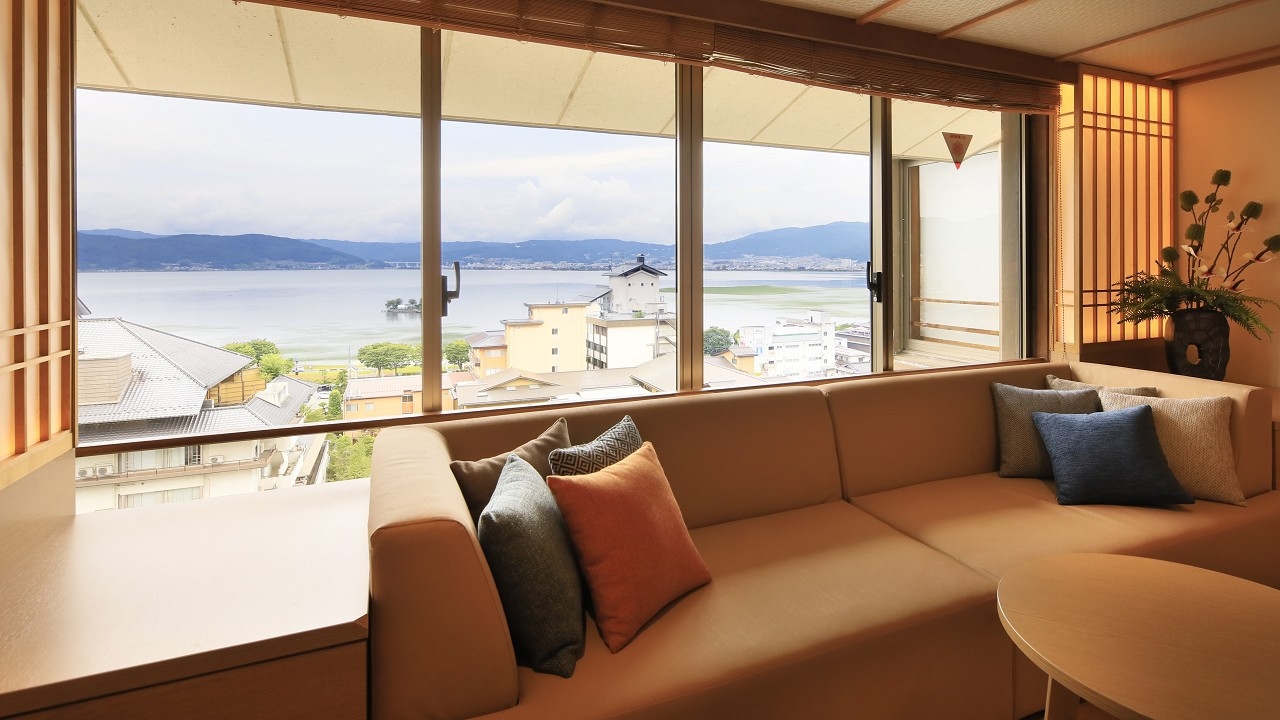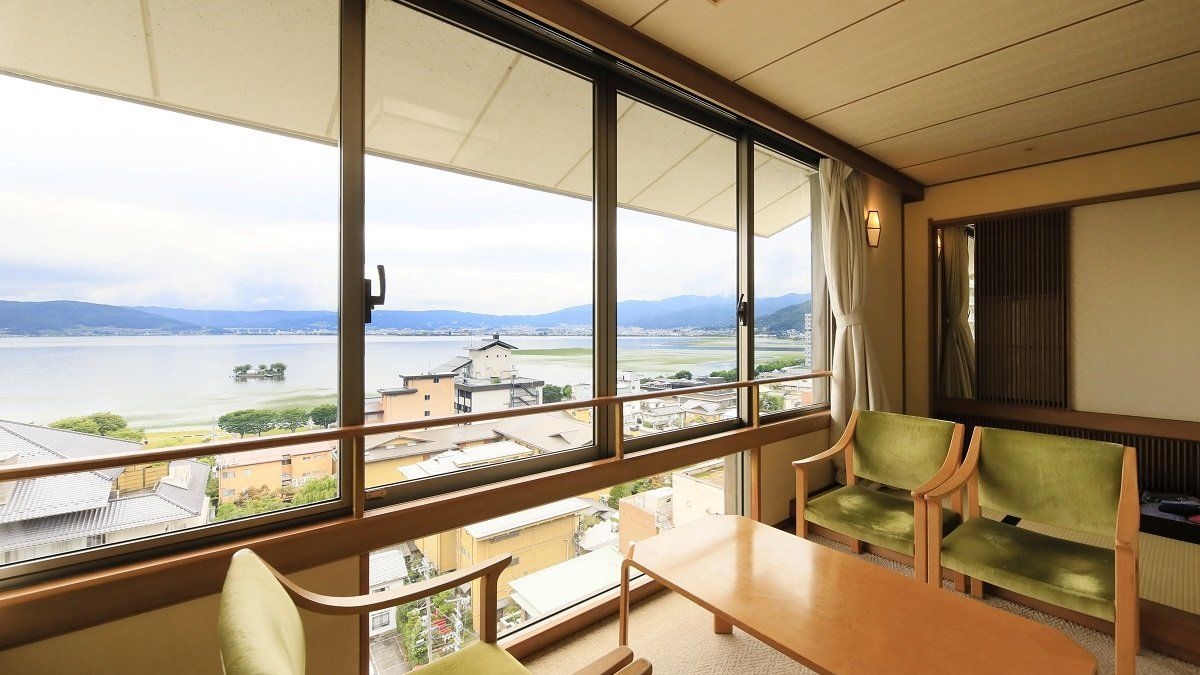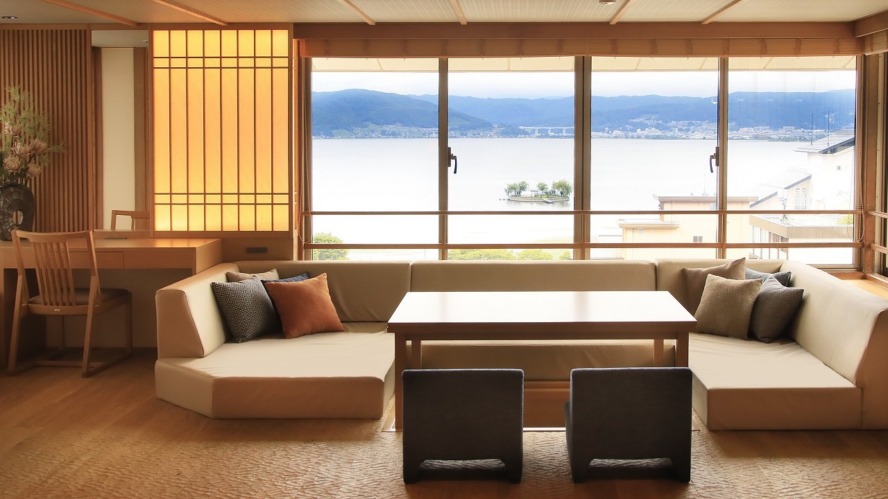 諏訪湖を望むフロアに位置するコーナールーム。間近にある諏訪湖、すっきりとした和の空間で、ごゆっくりとお寛ぎください。■諏訪湖を望むフロア/7〜9階