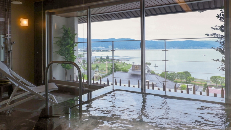 その半露天風呂に足を踏み入れた瞬間、目前に広がる見渡す限りの絶景に心奪われる・・・。それはまさに想像を超える贅沢空間。