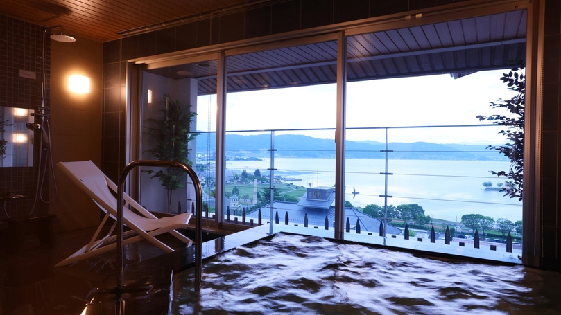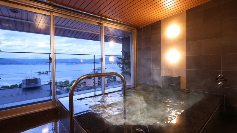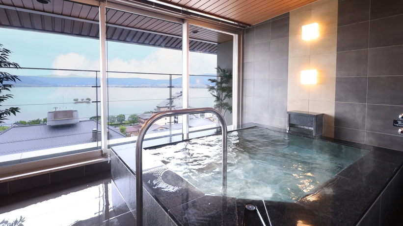 上諏訪温泉随一の地上高、最上階・プレミアムスイート専用フロアに位置するお部屋。半露天風呂は「七ツ釜源泉」かけ流し。お部屋またはフロアにドリンクをご用意。