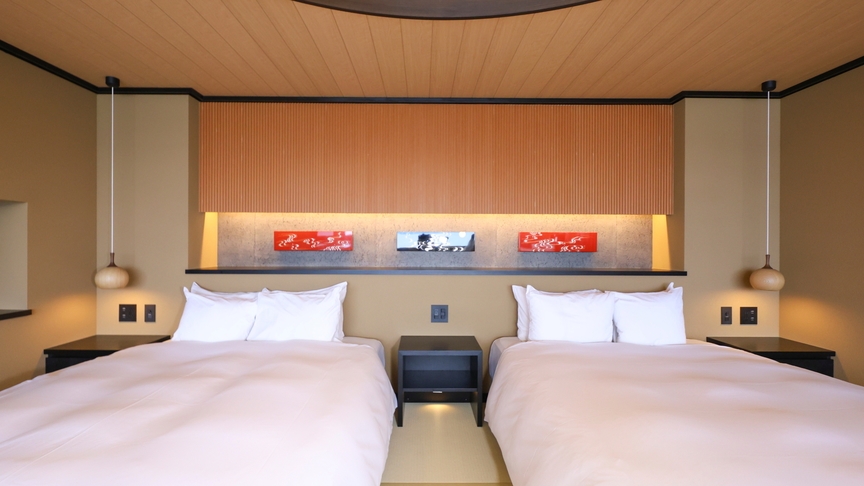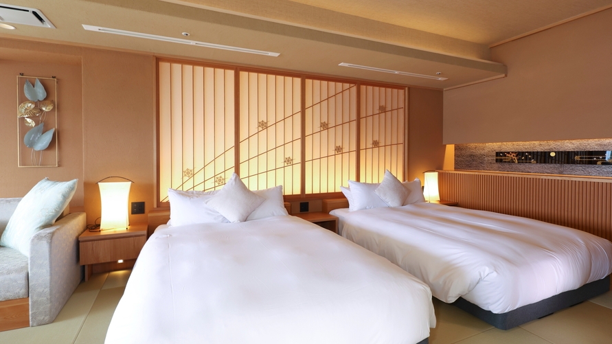 諏訪湖一望フロアに位置するリニューアル・ルーム。琥珀色を想わせる木と光のぬくもりに包まれる、あたたかいイメージのお部屋です。