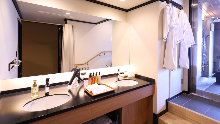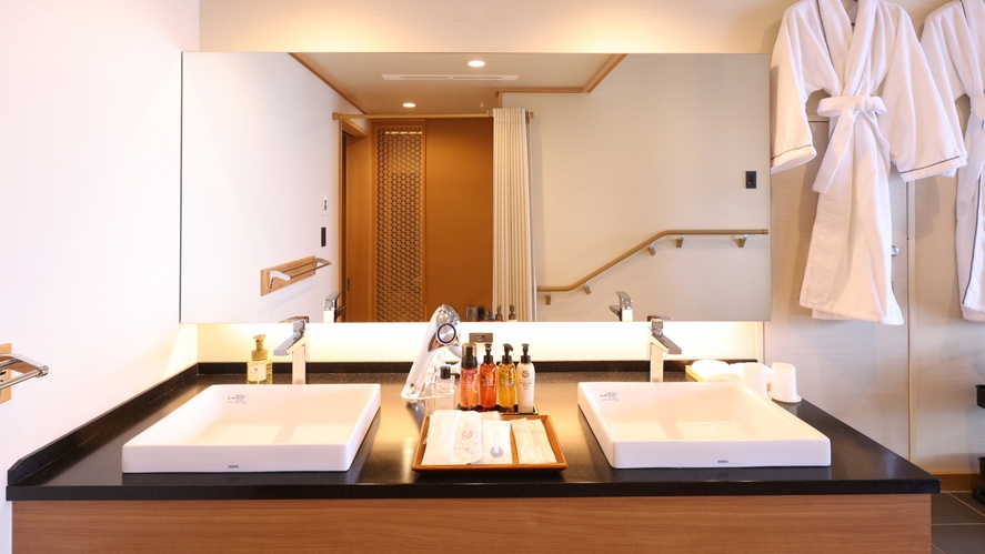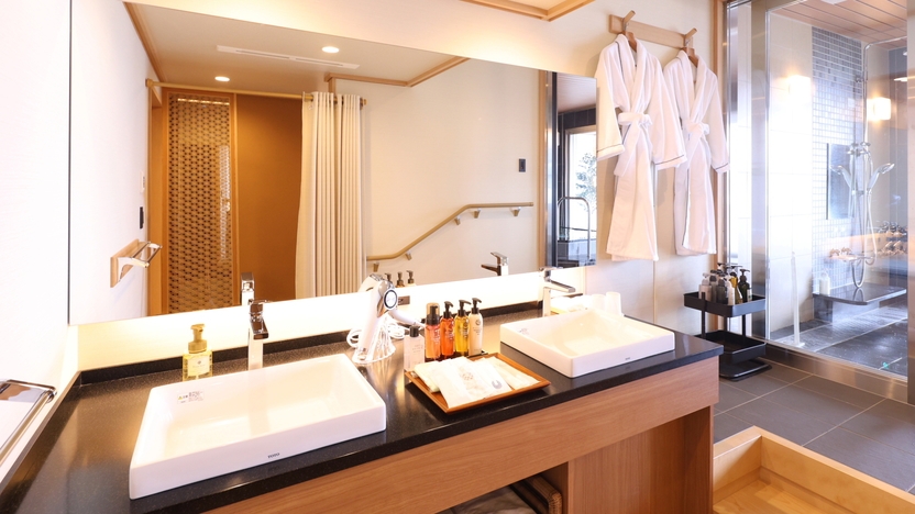 上諏訪温泉随一の地上高、最上階・プレミアムスイート専用フロアに位置するコーナールーム。半露天風呂は「七ツ釜源泉」かけ流し。お部屋またはフロアにドリンクをご用意。