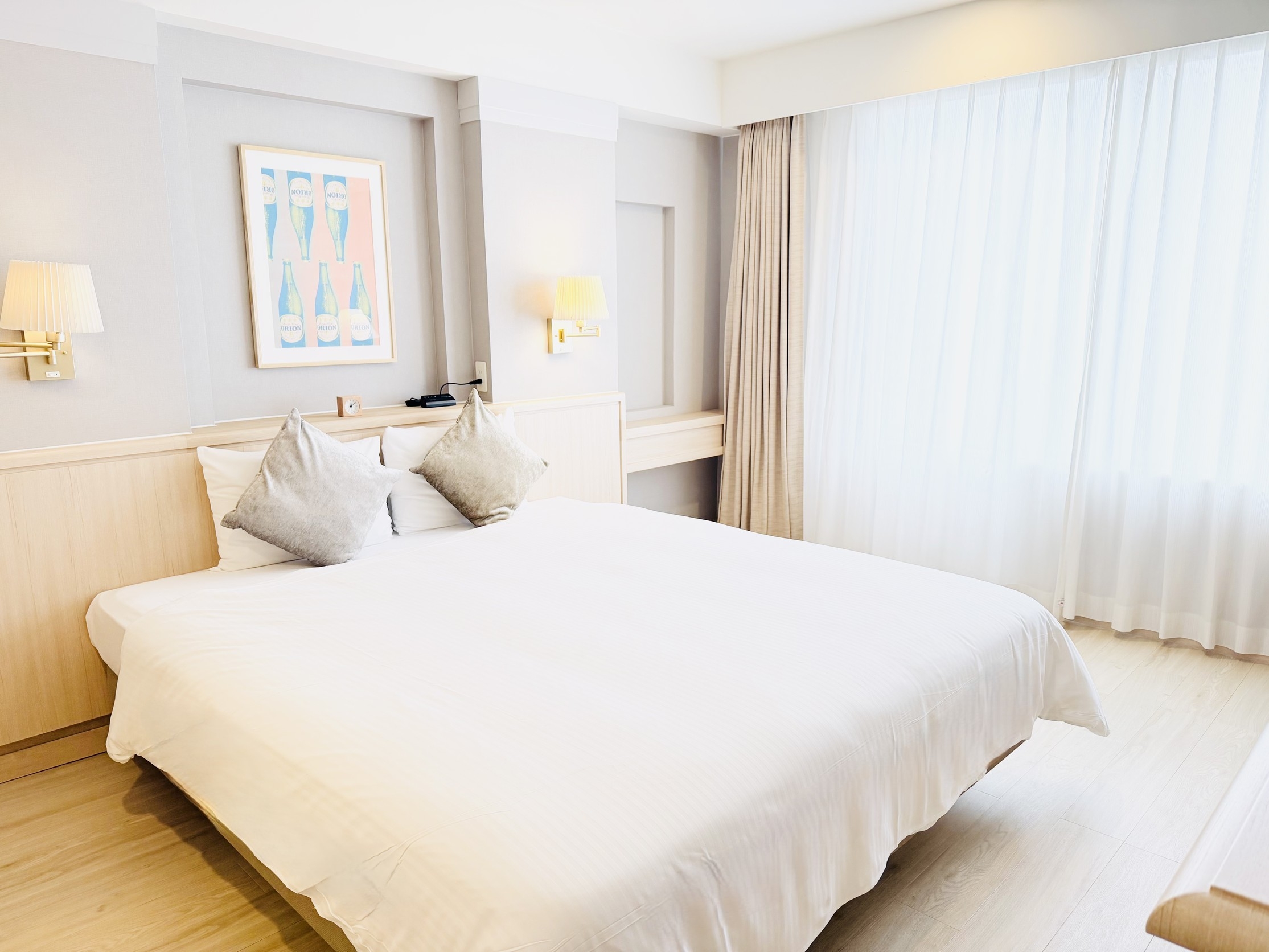 広めのベッドが心地よい眠りをお約束。上層階の快適な空間でリラックスいただけます。ゆったりと贅沢なご滞在をお楽しみください。