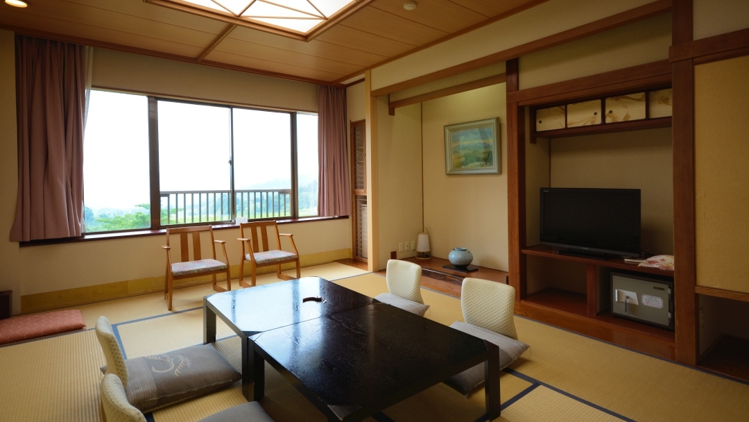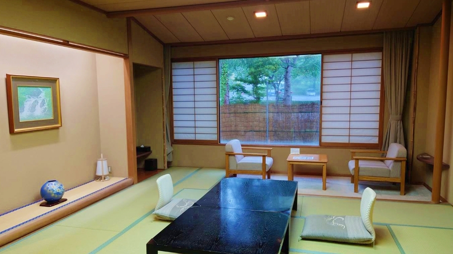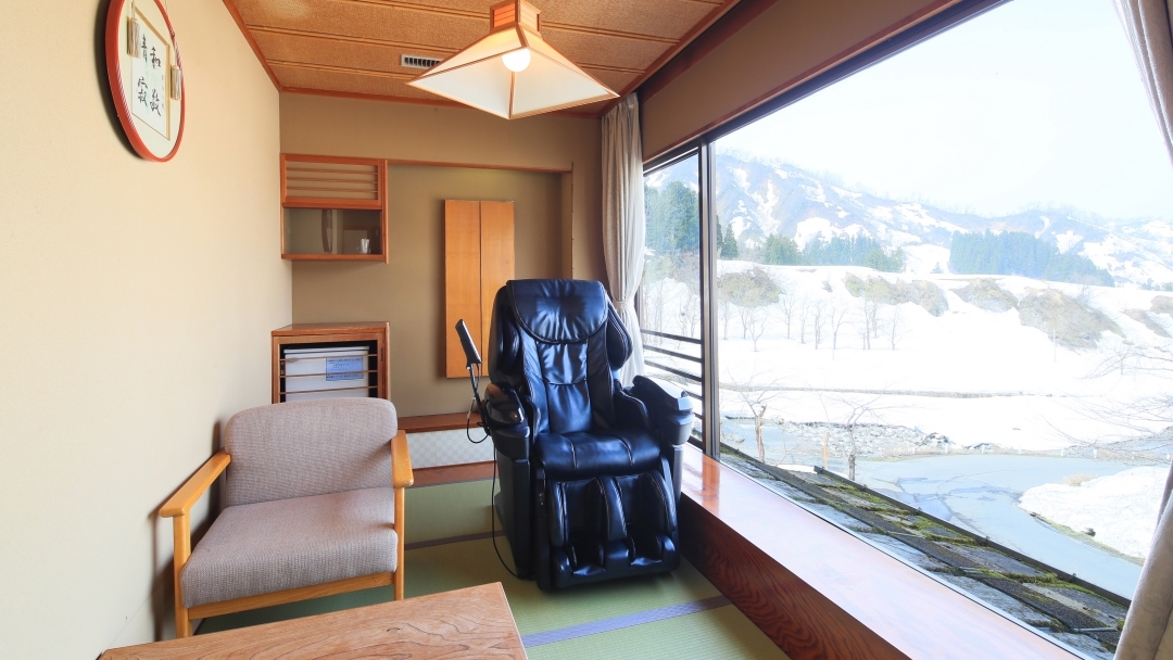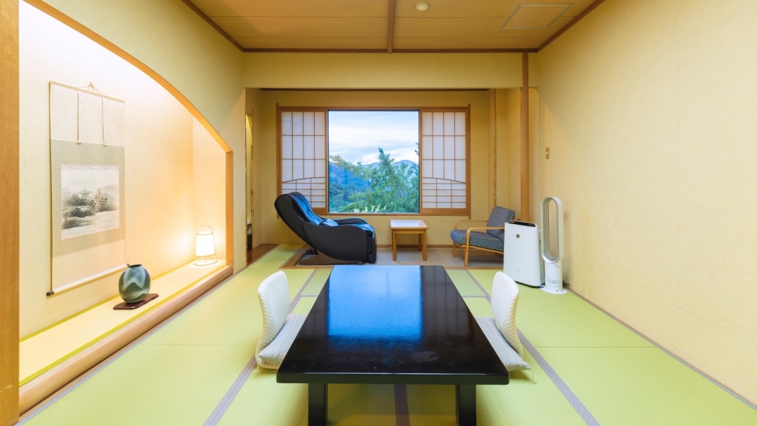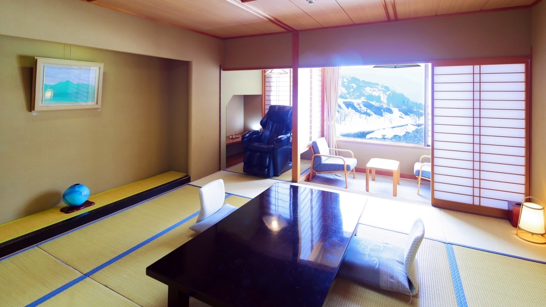 記念日やご褒美旅におすすめの特選和室。四季折々の絶景を望む窓辺で、マッサージチェアに身を委ねる極上の時間。※一部バスなし有。当館自慢の大浴場でお寛ぎください