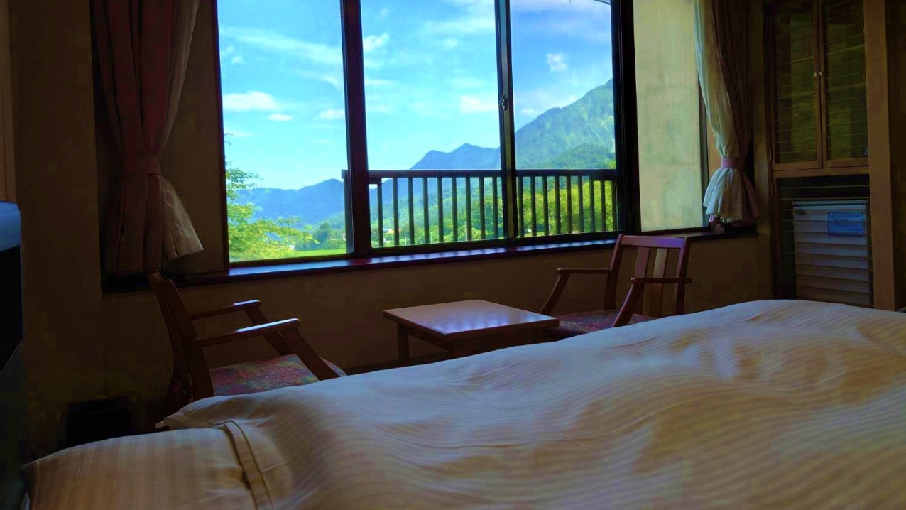 山々と広がる田園の風景をお部屋から望める、快適なベッド付き和室。高級マットレス「シモンズ」のツインベッドで上質な眠りを。お子様の受入なし。